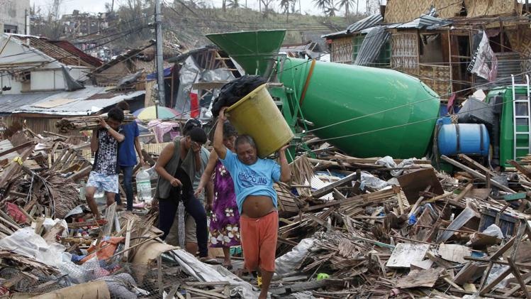 | Vài người dân bước qua đống đổ nát khổng lồ ở thành phố Tacloban với những đồ đạc mà họ thu lượm hôm 11/11. Ảnh: Reuters. |