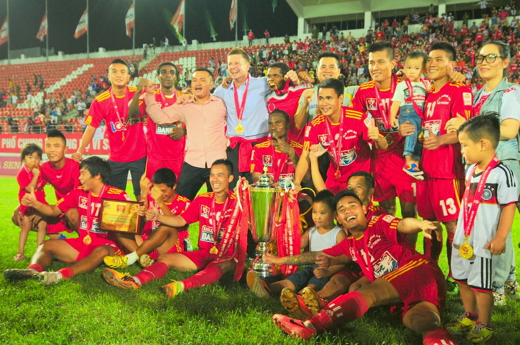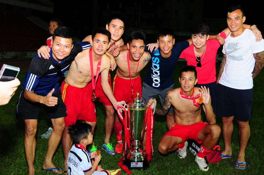 Các cầu thủ Hải Phòng ăn mừng Cup vô địch cùng ban huấn luyện.