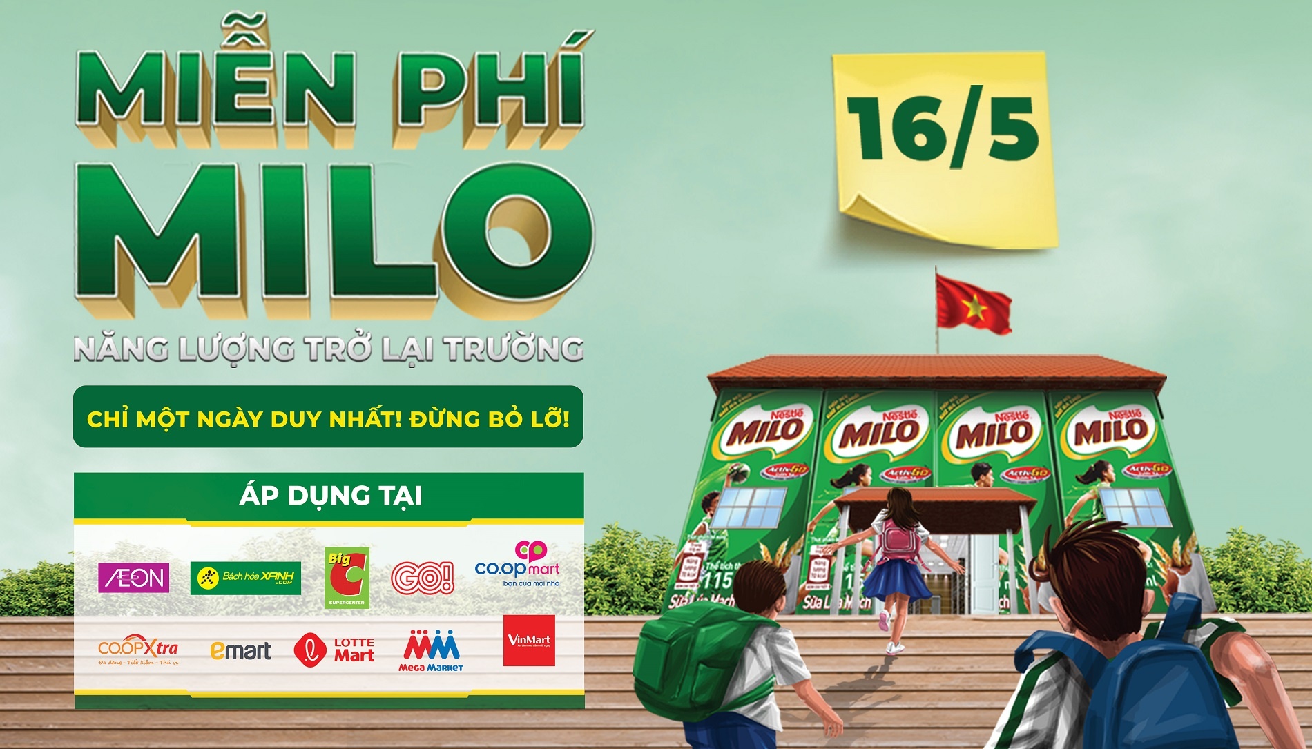 Chương trình “2 triệu hộp Milo tiếp sức cho trẻ đến trường” diễn ra vào ngày 16/5 tại các siêu thị lớn trên toàn quốc. Với mỗi hóa đơn mua sắm bất kỳ, mẹ sẽ được tặng một lốc (4 hộp) sữa lúa mạch Milo. Thông tin siêu thị được áp dụng chương trình, các mẹ tham khảo tại đây.