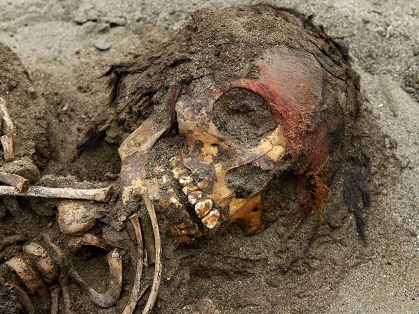 Oscar Gabriel Prieto, trưởng nhóm khảo cổ, đang quỳ gối cạnh bộ xương của một đứa trẻ với niên đại 800 năm gần làng cá tại Peru. Đây là một trong số 42 bộ xương do các nhà khảo cổ phát hiện ở một ngôi mộ nông trên đụn cát gần thị trấn Huanchaquito. Ngoài 42 bộ xương trẻ con, người ta còn tìm thấy 76 bộ xương của giống lạc đà không bướu. Nhóm nghiên cứu của Prieto đặt giả thiết về cái chết của lũ trẻ như một phần nghi lễ tôn giáo của tộc người Chimu. Nổi tiếng với những tiến bộ về thủy lợi, người Chimu độc chiếm bờ biển miền Trung và Bắc Peru từ những năm 1.100 tới 1.500 trước Công nguyên, khoảng thời gian mà người Inca thống trị văn hóa Peru.