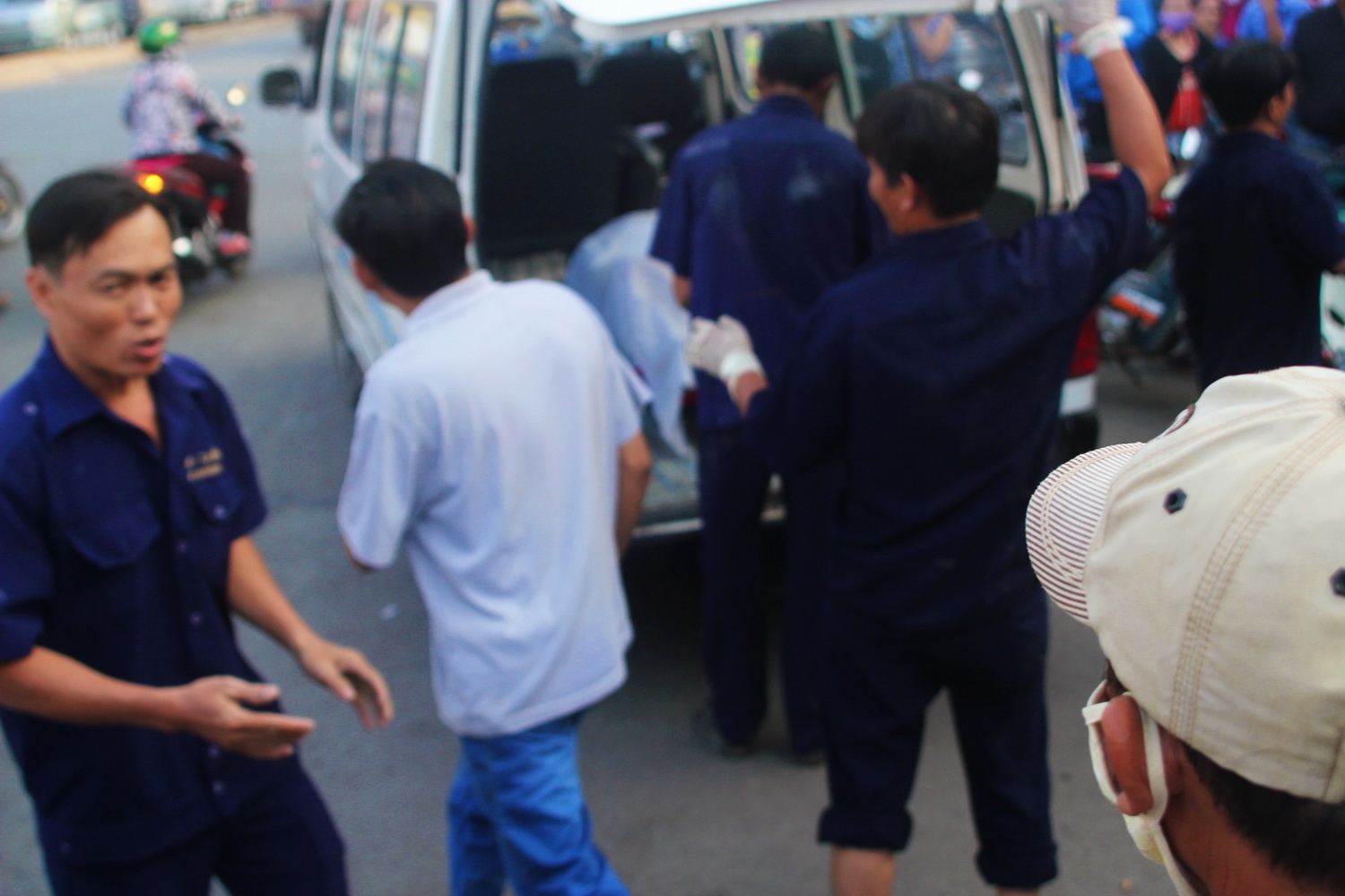 | Thi thể anh Hùng được đưa lên xe mang về nhà xác. |