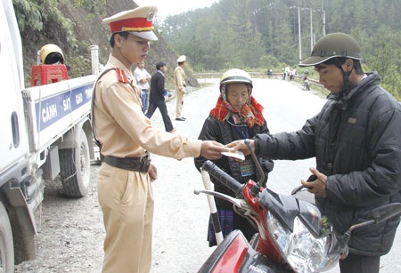 | CSGT tỉnh Yên Bái kiểm tra giấy tờ của lái xe vi phạm. |