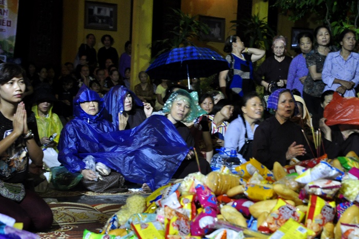 Phật tử dầm mưa dâng lễ lên chùa trong đêm