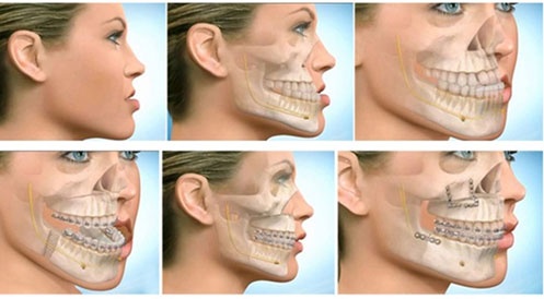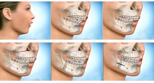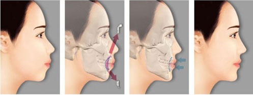 | Người móm hàm dưới, thiểu sản hàm trên sẽ được kết hợp Lefort I hàm trên để đẩy lùi về sau và lún lên trên, đồng thời BSSO hàm dưới và đẩy lùi về sau. |