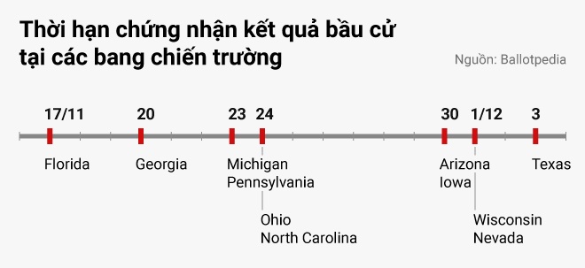 Một loạt bang sẽ chứng nhận kết quả bầu cử trong những ngày tới. Quá trình này phải hoàn tất trước ngày 14/12, thời điểm đại cử tri đoàn mỗi bang bỏ phiếu để chính thức chọn ra tổng thống tiếp theo.