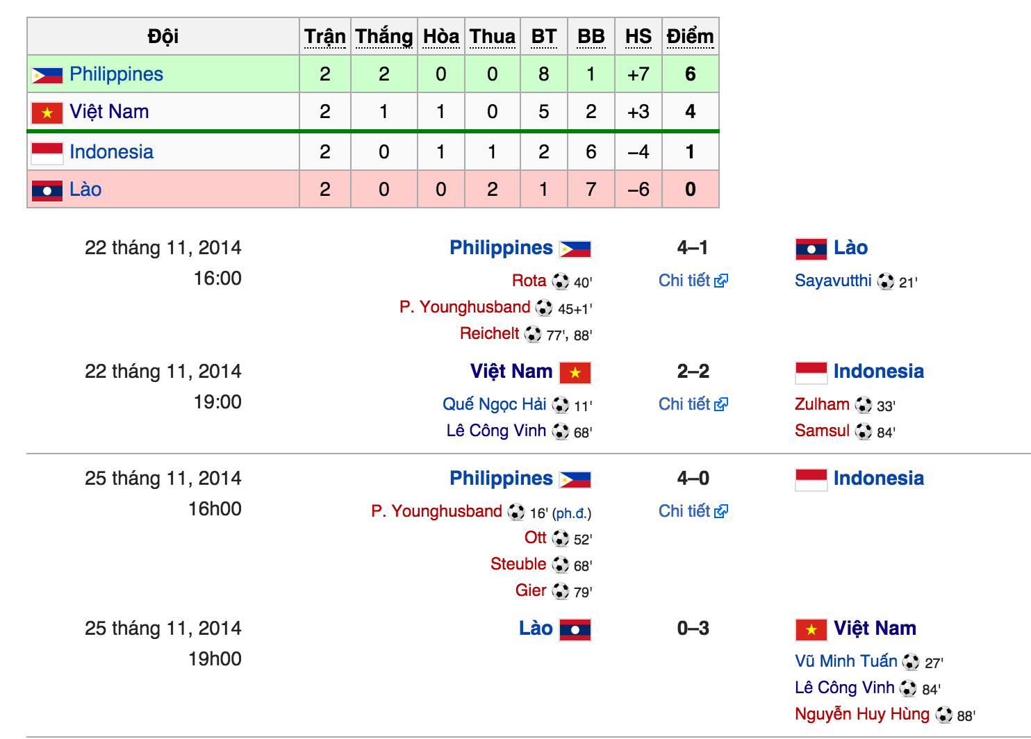 | Thứ tự xếp hạng và kết quả các trận đấu đã diễn ra tại bảng A AFF Cup 2014. Ảnh: Wiki |