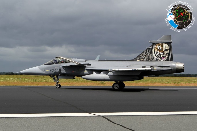 Máy bay JAS-39 Gripen của Cộng hòa Czech với hình vẽ nửa đầu hổ, nửa đầu lâu.
