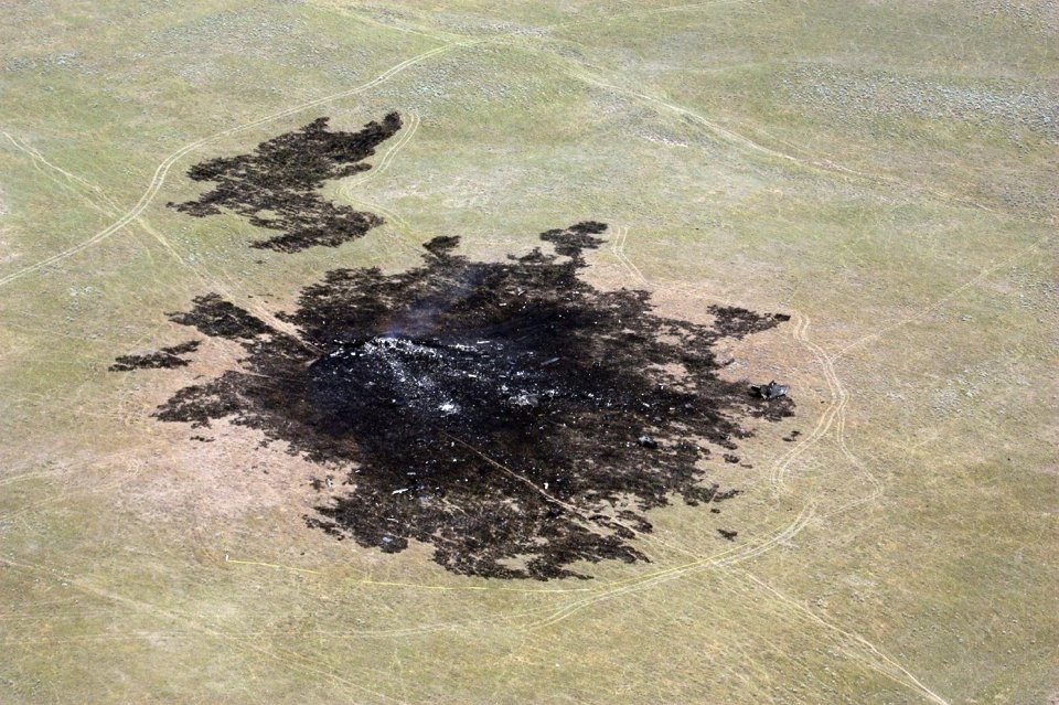 Các bức không ảnh cho thấy máy bay vỡ tan thành nhiều mảnh và cháy xém sau khi rơi xuống đất. Mảnh vỡ văng ra một khu vực khá rộng.