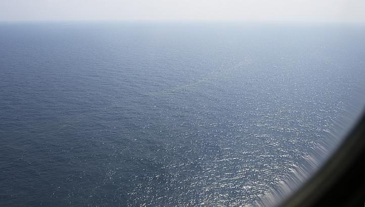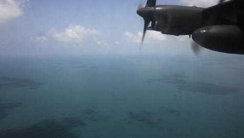 | Vùng biển bên dưới chiếc C-130 của Không quân Singapore hôm 9/3. Đây là khu vực chuyến bay MH370 của Malaysia Airlines biến mất khỏi màn hình radar lúc sáng sớm ngày 8/3 cùng 239 hành khách và thành viên phi hành đoàn. |