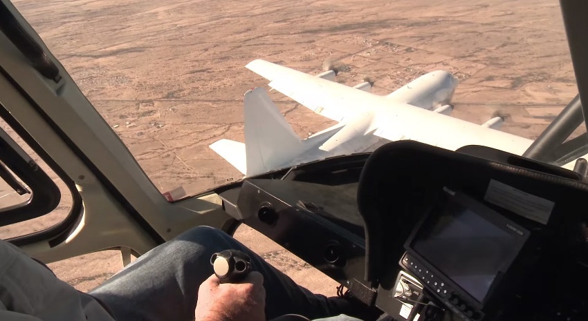 Một trực thăng khác bay quanh chiếc C-130 để ghi lại toàn bộ cảnh quay. |