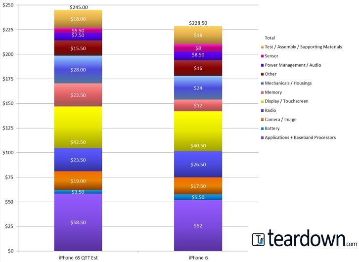 Phí linh kiện là 245 USD trong khi giá bán ra của một chiếc iPhone 6S 64 GB là 749 USD. Teardown cho hay, chi phí linh kiện của iPhone 6S cao hơn khoảng 16,5 USD so với phiên bản iPhone 6 năm ngoái, phần lớn là do chip xử lý mới, camera và cảm biến 3D Touch.