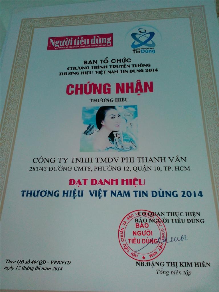 Sau gần hai năm hoạt động kinh doanh, công ty mỹ phẩm của Phi Thanh Vân đã nhanh chóng phát triển với nhiều sản phẩm làm đẹp đa dạng. Công ty này cũng vừa nhận được cúp vàng Thương hiệu Việt Nam tin dùng 2014 do người tiêu dùng bình chọn.