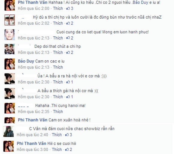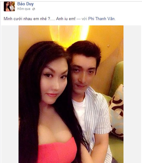 Với dòng status ngắn gọn nhưng đầy ý nghĩa: “Mình cưới nhau em nhé ? Anh yêu em”, Bảo Duy đã khiến Phi Thanh Vân ngập tràn hạnh phúc bên những lời chúc mừng của đông đảo người hâm mộ. Đáp lại lời cầu hôn từ bạn trai, Phi Thanh Vân cũng thổ lộ ngay bên dưới bằng comment : “Hahhaa! Ai cũng ko hiểu. Chỉ có 2 người hiểu. Bảo Duy e yêu anh”. Trước lời chúc mừng và thắc mắc củ người hâm mộ, Phi Thanh Vân cũng khẳng định ngay: "Chị sẽ cưới".