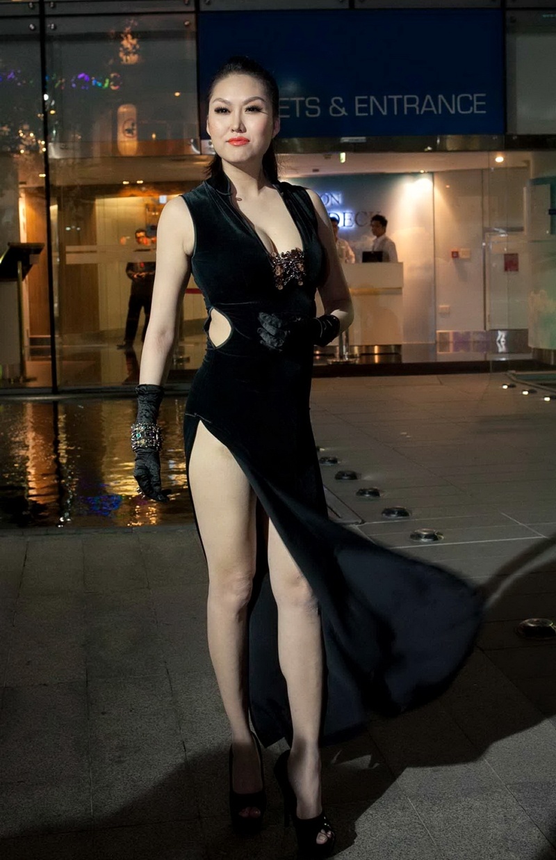 | Trong bộ váy đen khoét cổ sâu, Phi Thanh Vân rất quyến rũ và gợi cảm. Cô cũng không quên khoe đôi chân thon dài với tà váy xẻ cao. Gương mặt của cô cũng không vương chút lo nghĩ mà rất rạng rỡ. |