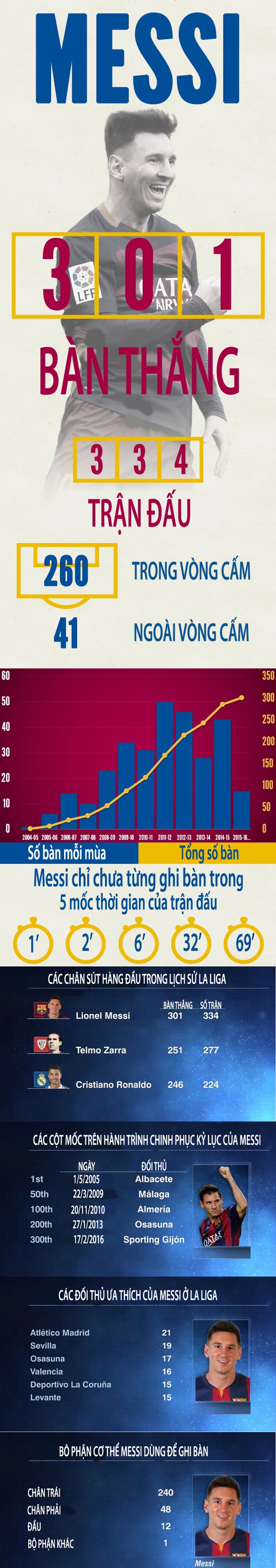 Messi là cầu thủ đầu tiên xô đổ cột mốc 300 bàn ở La Liga. Ngoài ra anh còn ngẫu nhiên ghi bàn thắng thứ 10.000 của Barcelona ở đấu trường này.