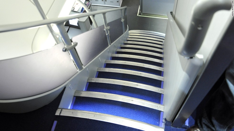 Tiếp viên và hành khách sử dụng cầu tháng để di chuyển giữa các tầng trong thân máy bay. |