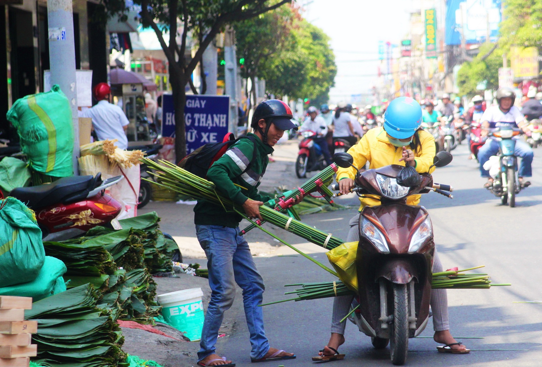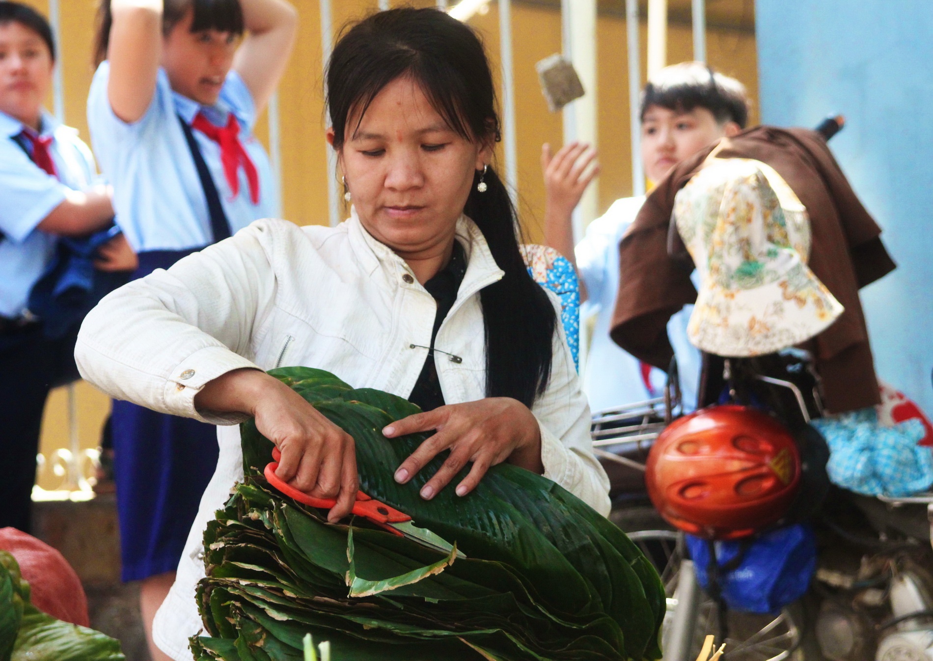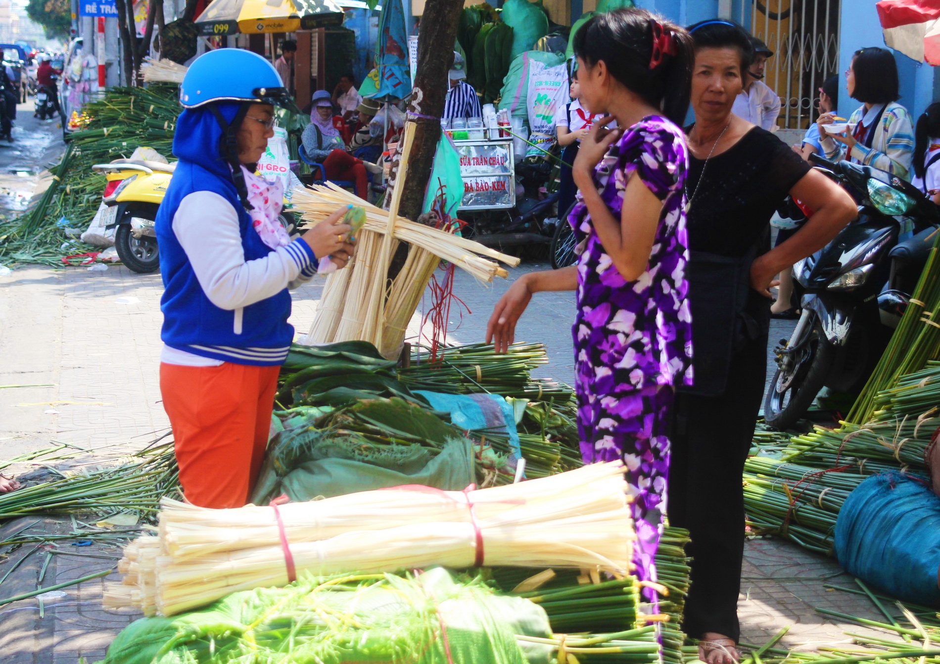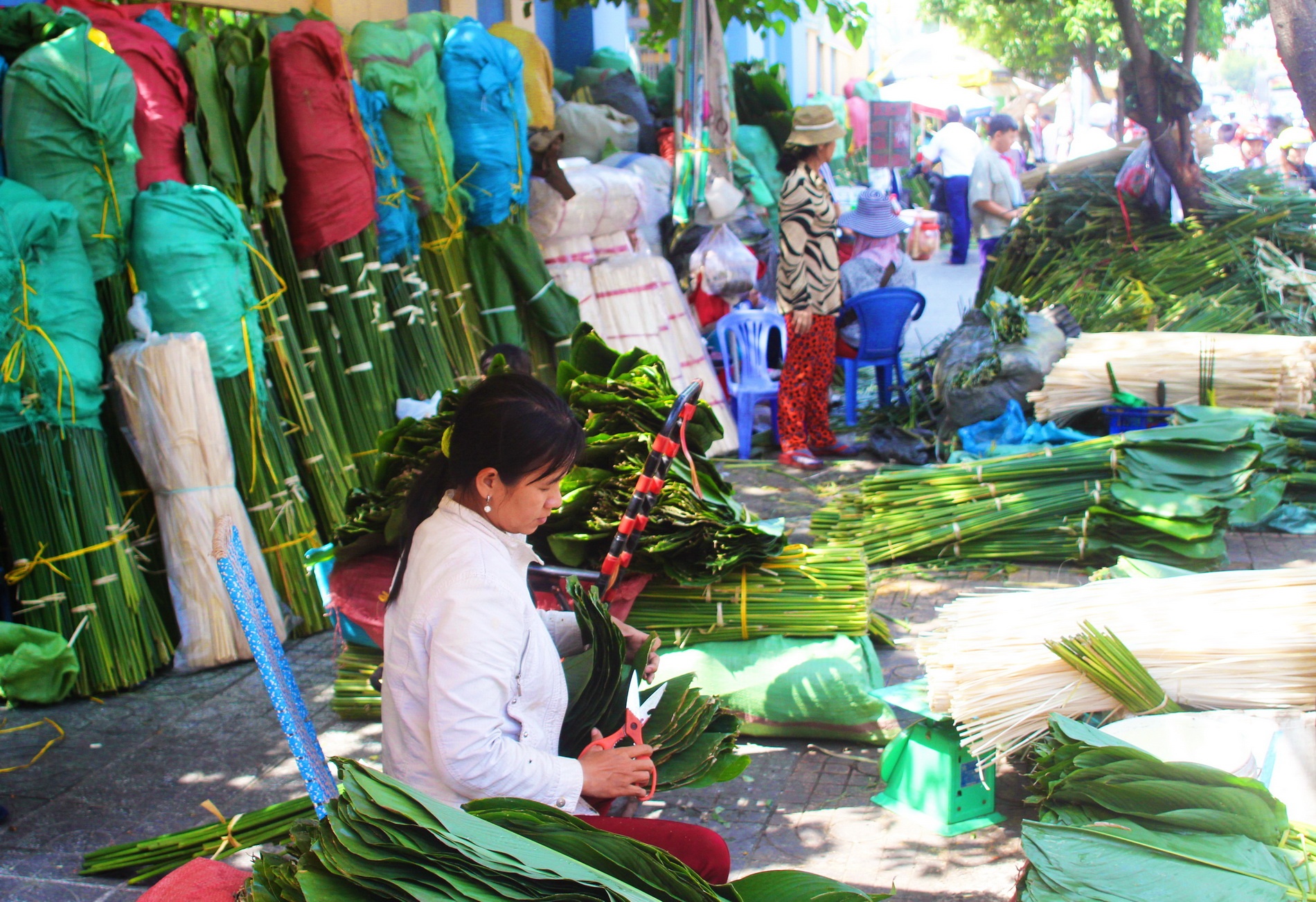 Trong lúc chờ khách, nhiều lái buôn tranh thủ cắt phần khô của lá. Một số tiểu thương cho biết lượng khách đến chợ ngày càng giảm, không khí cũng không nhộn nhịp bằng các năm trước vì ít người tự nấu bánh, mà đi siêu thị để mua.