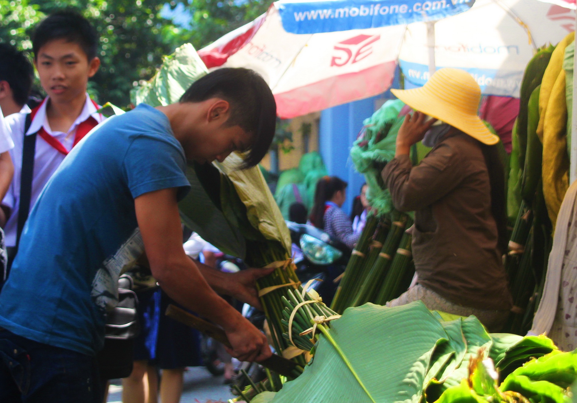 Cứ đến những ngày giáp Tết, các thương lái bắt đầu chuyển lá dong tới chợ ông Tạ (trên đường Cách Mạng Tháng Tám và Phạm Văn Hai, quận Tân Bình, TP.HCM) để bày bán. Từng bó lá dong xanh rì dựng dọc đoạn đường dài gần 500m khiến ai đi qua cũng thấy lòng rạo rực, nhất là những người con xa xứ.