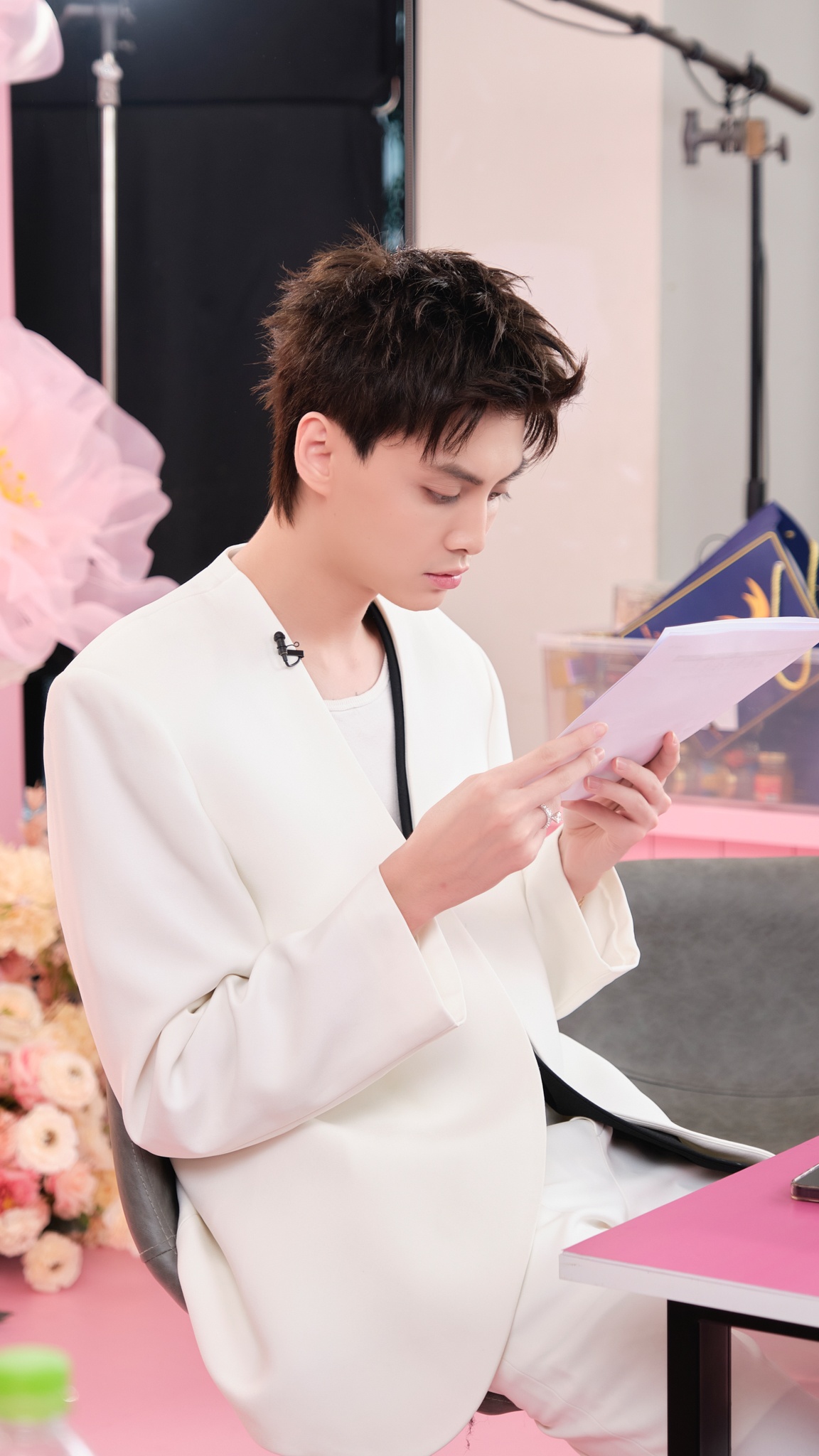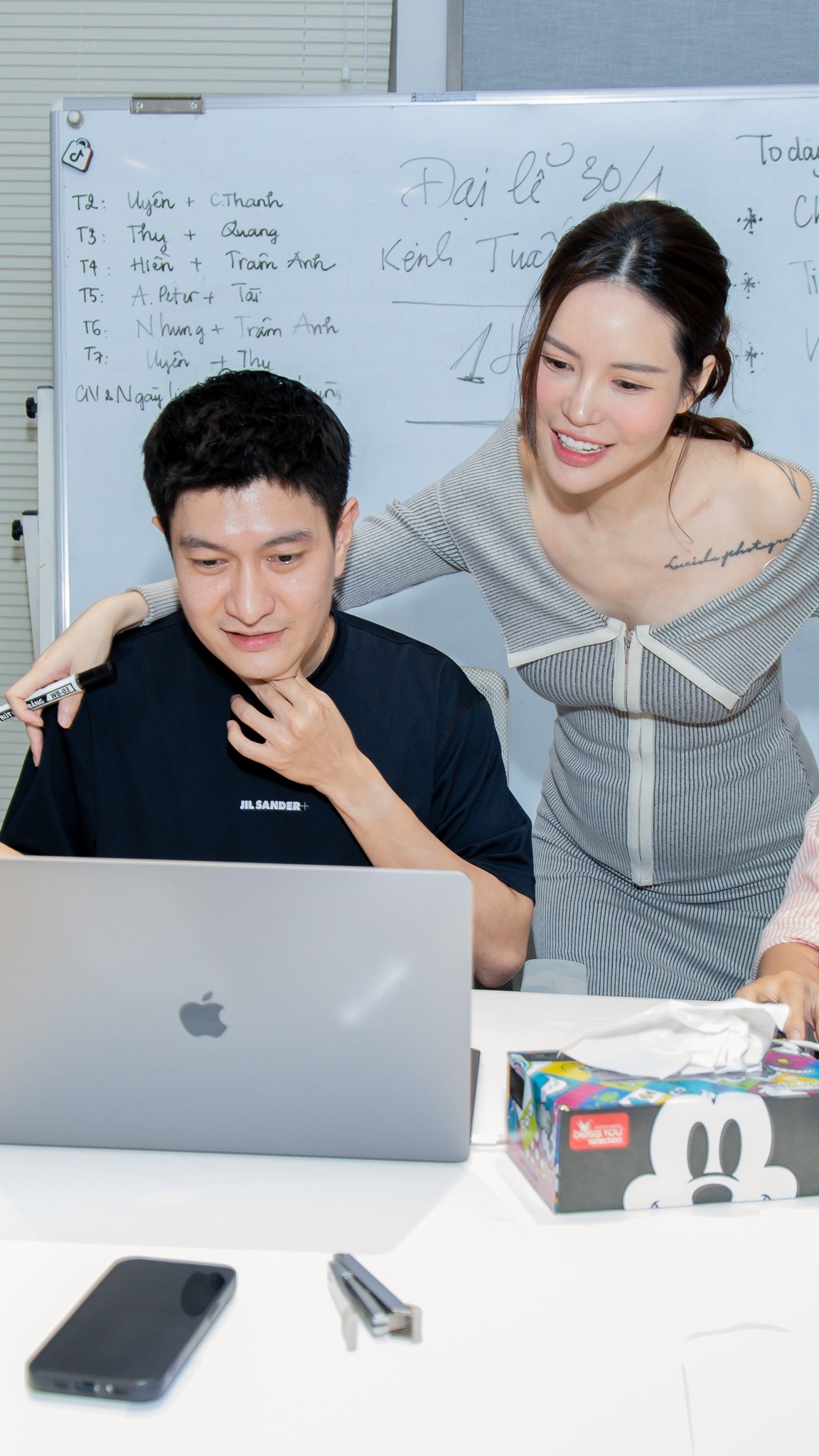 | Đây là chồng tôi - Tuấn Dương, người sẽ cùng tôi thực hiện buổi livestream này. Anh ấy cũng đến sớm để đọc kịch bản và cùng tôi kiểm tra lại lần cuối trước khi lên sóng. |