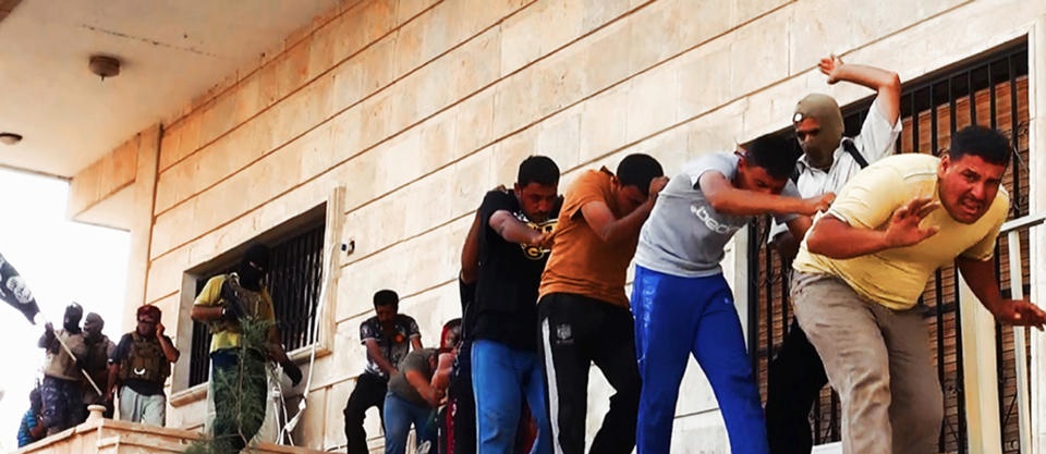 | Ở một nơi khác, chiến binh ISIL buộc các binh sĩ cúi và đi thành hàng. |