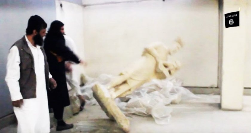 IS quay video tại bảo tàng Ninawa, ở Mosul, Iraq hồi tháng 2/2015. Trong đoạn băng, hàng chục chiến binh IS đẩy những bức tượng điêu khắc 3.000 năm xuống mặt đất và dùng thang, búa tạ và máy khoan để đập tới khi chúng vỡ thành từng mảnh. Một trong số những bức tượng là vị thần hộ mệnh trong đế chế cổ Assyrian, có niên đại từ thế kỷ thứ 9 trước Công nguyên, theo International Business Times.