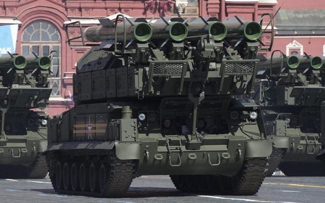 | Một bệ phóng tên lửa Buk của quân đội Nga trong một buổi diễu hành qua Quảng trường Đỏ tại thủ đô Moscow hôm 9/5. Ảnh: AP |