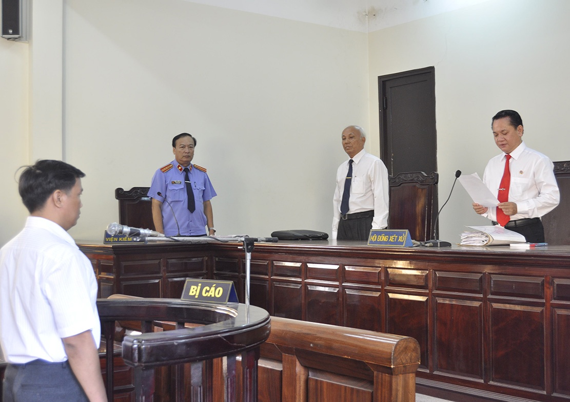 | Chủ tọa phiên tòa Trần Thanh Tùng (bìa phải) tuyên tạm hoãn phiên tòa. Ảnh: Ngọc An. |