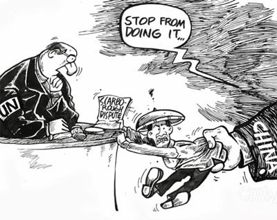 | Tranh biếm hoạ nước ngoài về việc Trung Quốc muốn ngăn cản Philippines đến gần Toà án quốc tế. |