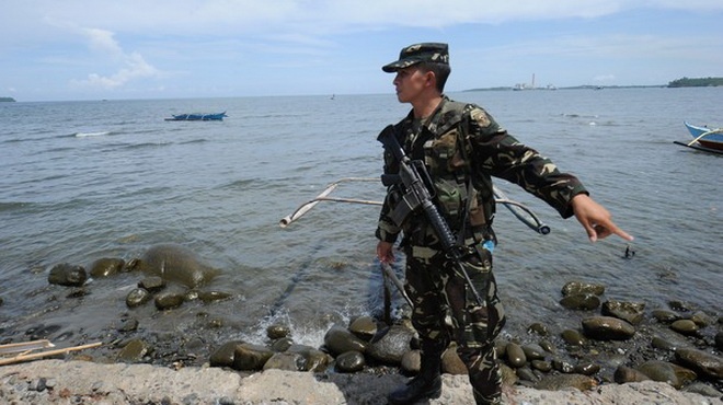 Một binh sĩ Philippines ở bờ biển tỉnh Zambales, gần bãi đá ngầm Scarborough. Ảnh: Getty Images |