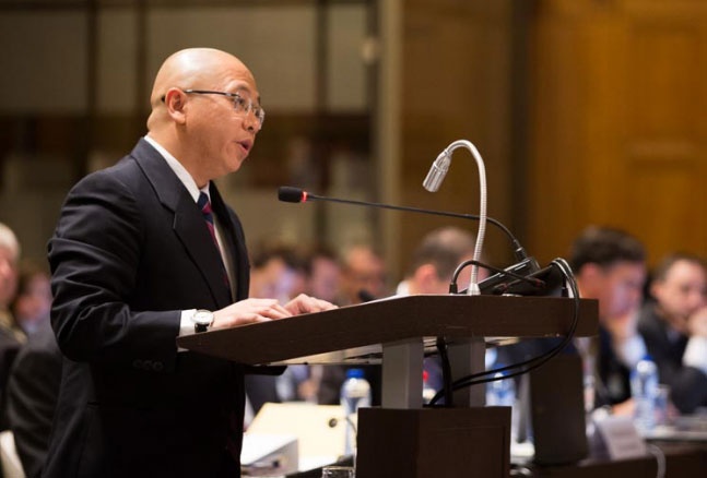 Trưởng đoàn luật sư Philippines Florin T. Hilbay đọc tuyên bố của Manila tại tòa. Ảnh: PCAcases.com |