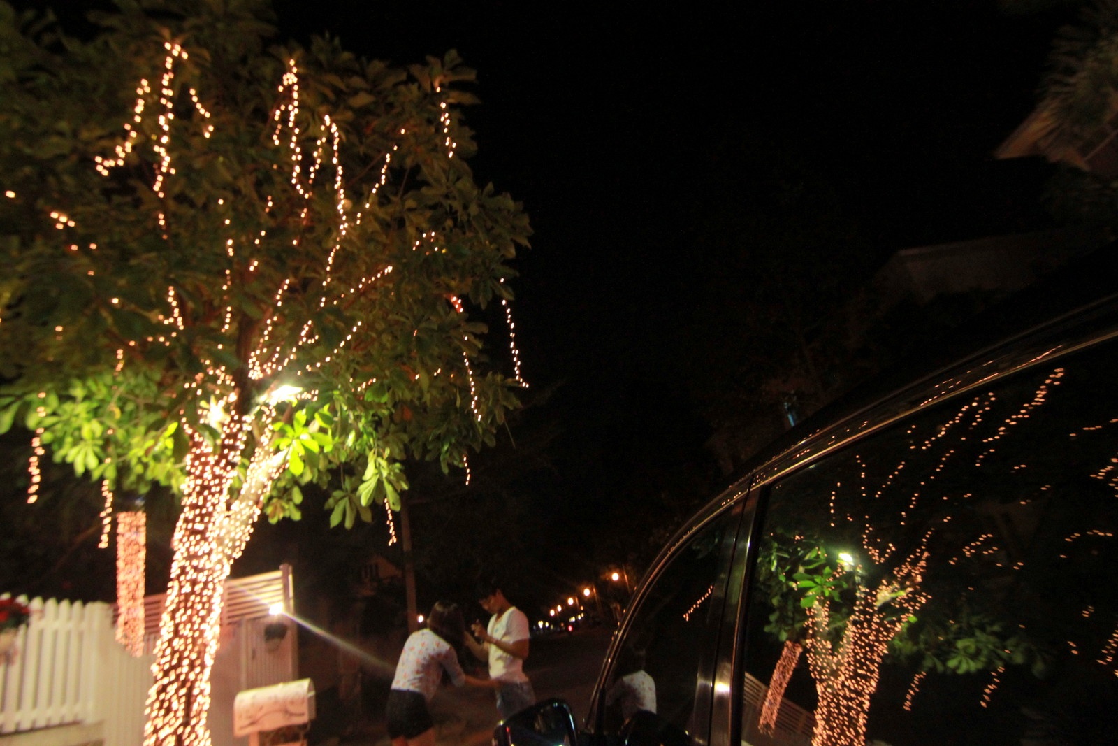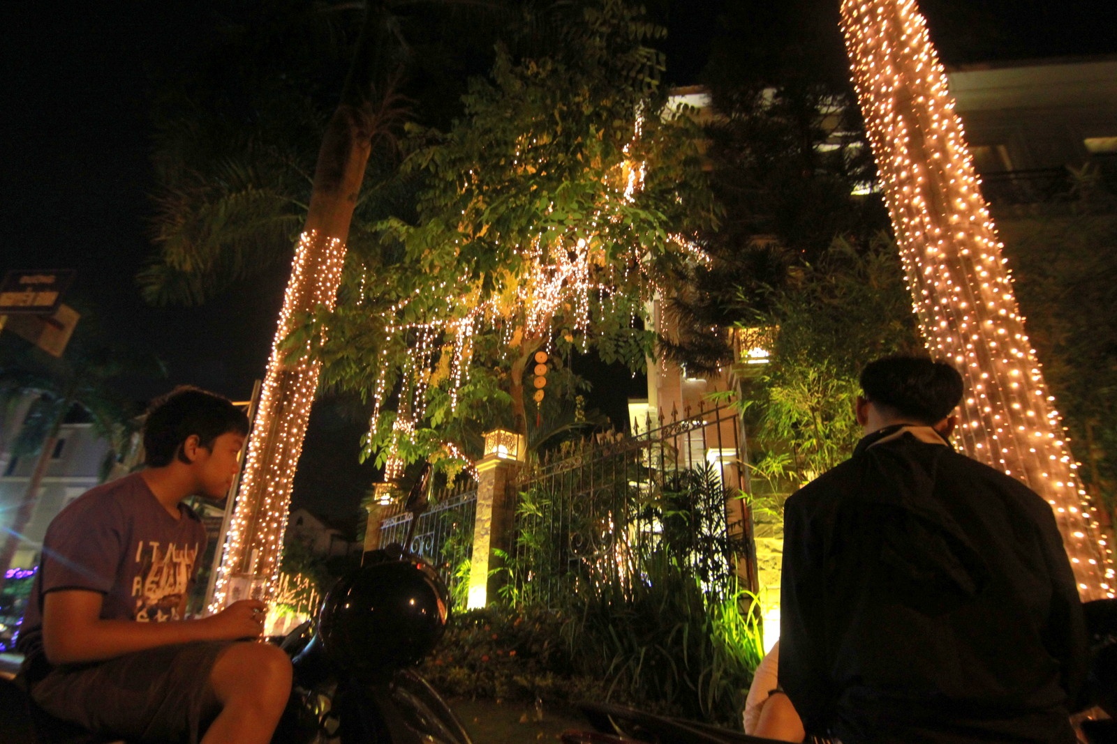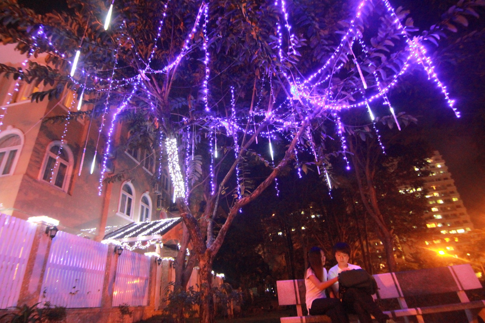 | Đôi bạn trẻ tâm sự dưới tán cây được trang trí đèn. |