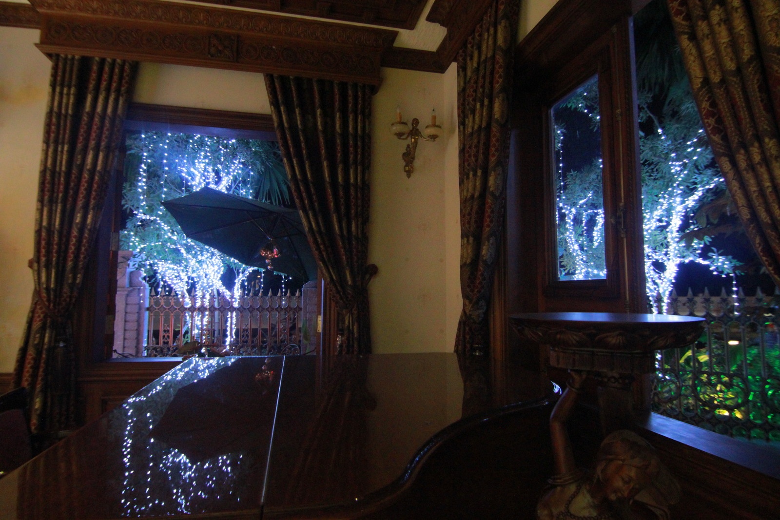 | Không gian bên trong một biệt thự với những của sổ hướng ra khuôn viên bên ngoài rực rỡ đèn hoa. |