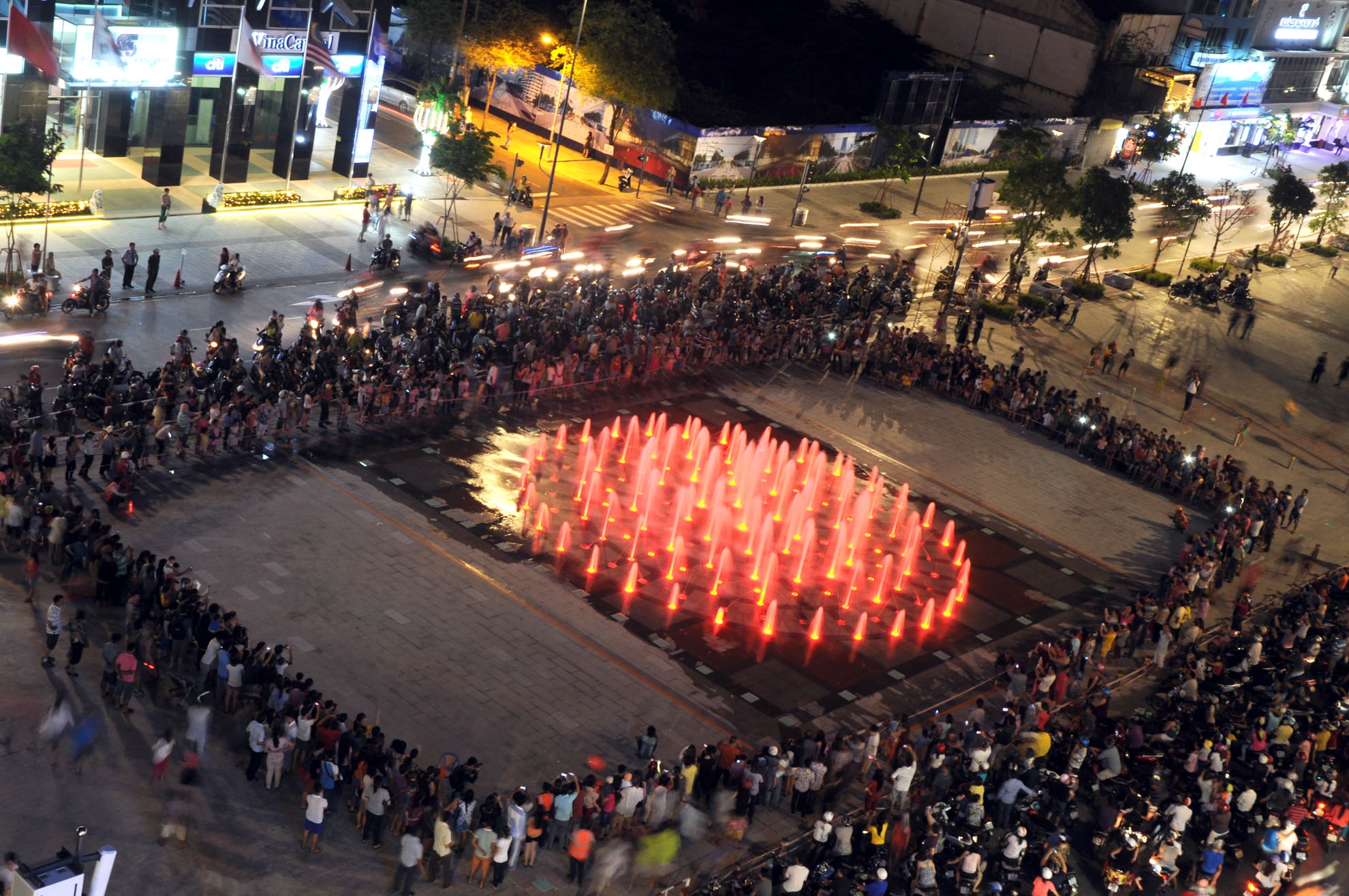 Hàng nghìn người dân từ các quận, huyện và du khách đổ về trung tâm để đi dạo, hóng mát và xem nhạc nước ở công trình hiện đại này.