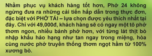Để đáp ứng nhu cầu ẩm thực của thực khách Việt trong nhịp sống rất nhanh của thời hiện đại, Phở 24 ra đời để mang đến cho khách hàng những tô phở truyền thống được chế biến và phục vụ theo phong cách hiện đại. Mỗi tô phở luôn mang đậm phong vị Việt Nam, là kết quả của một qui trình nấu phở chặt chẽ theo bí quyết gia truyền mà tất cả các cửa hàng trong chuỗi đều áp dụng. Trong hơn 10 năm phát triển, chất lượng luôn là ưu tiên hàng đầu mà nhãn hàng cam kết trong từng tô phở. Một trong những cải tiến mới nhất của Phở 24 là dùng thịt bò nhập khẩu để món phở tái ngon hơn, bổ dưỡng hơn.