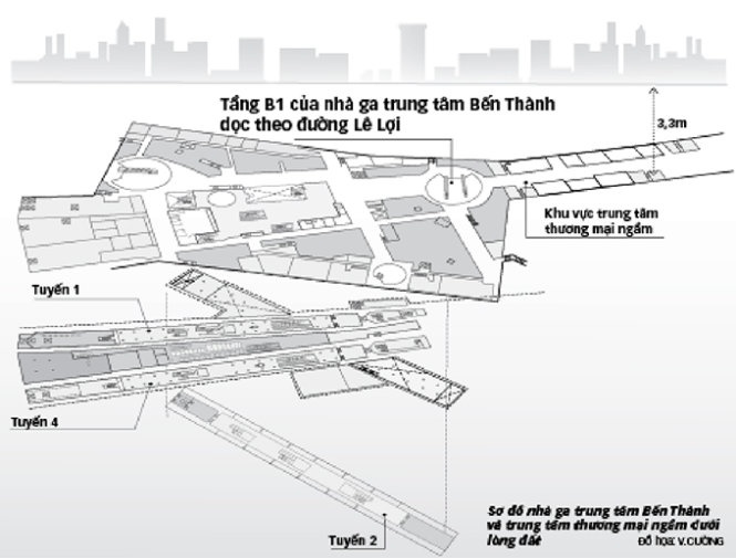 Trong quá trình xây dựng gói thầu 1a - nhà ga trung tâm Bến Thành sẽ kết hợp triển khai thi công xây dựng trung tâm thương mại ngầm trong lòng đất đoạn từ công viên 23-9, đường Lê Lợi đến Nhà hát TP dài khoảng 700 m, rộng 60m (lộ giới đường Lê Lợi) và nằm cách mặt đất khoảng 3 m.
