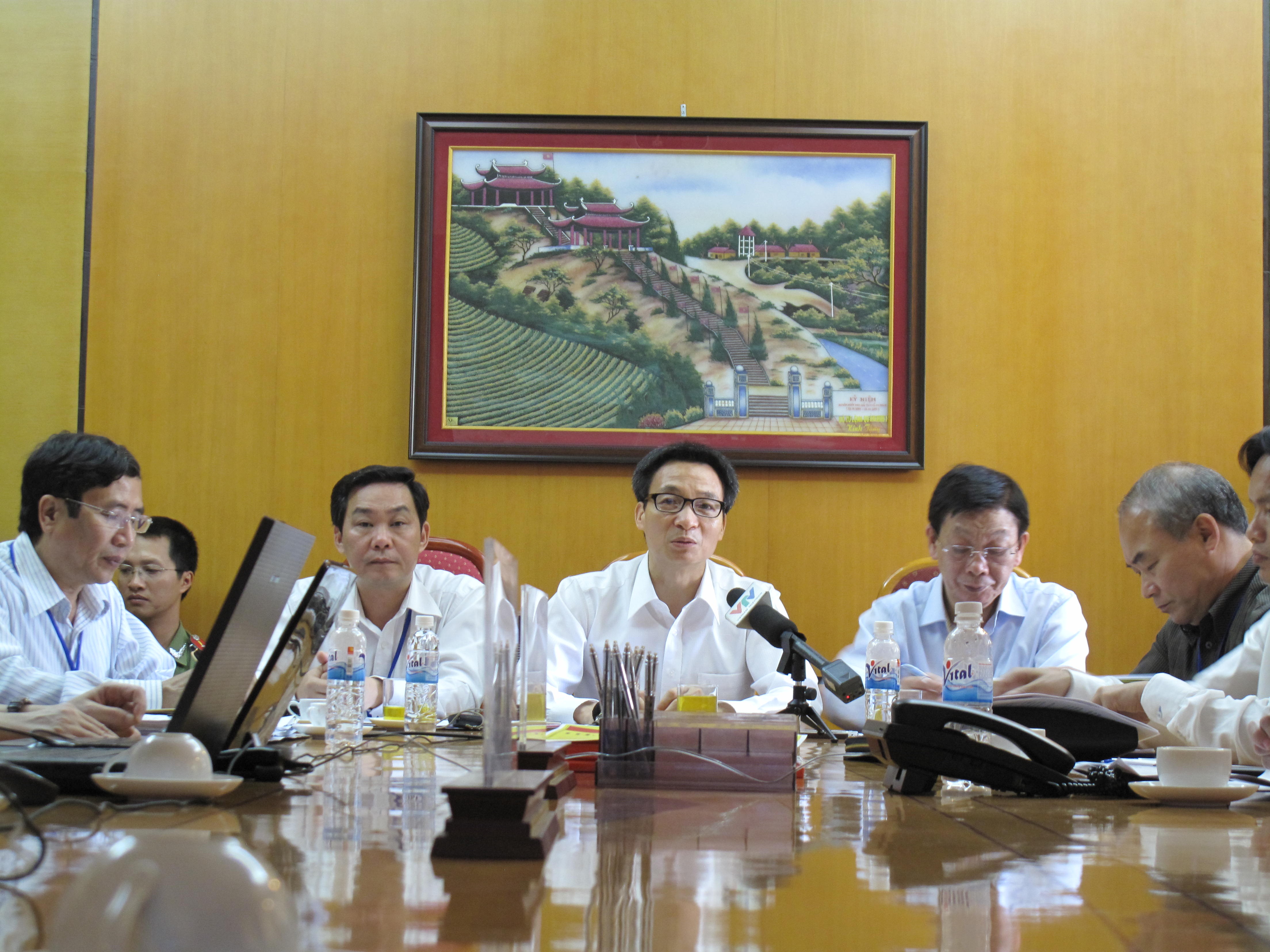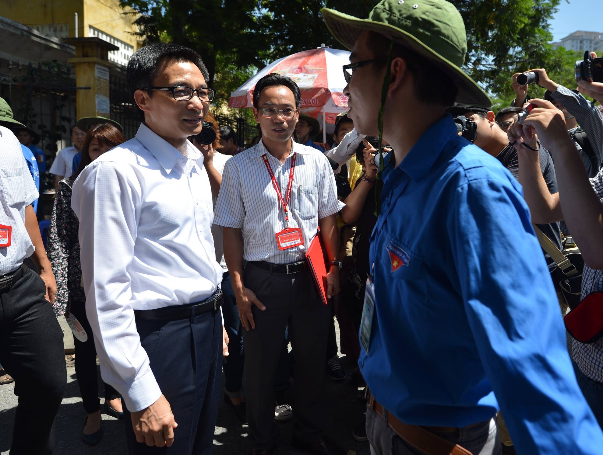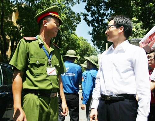 | Sáng 1/7, Phó thủ tướng Vũ Đức Đam kiểm tra phòng thi ở ĐH Bách khoa Hà Nội và làm việc với Ban chỉ đạo thi của TP Hà Nội, Bộ GD&ĐT. Phó thủ tướng Vũ Đức Đam nhấn mạnh: “Điều quan trọng là hướng dẫn chi tiết, để nhân dân yên tâm tất cả các hội đồng, cụm chấm như nhau, không lo chuyện chấm chặt, chấm lỏng”. Ảnh: Tuệ Anh. |