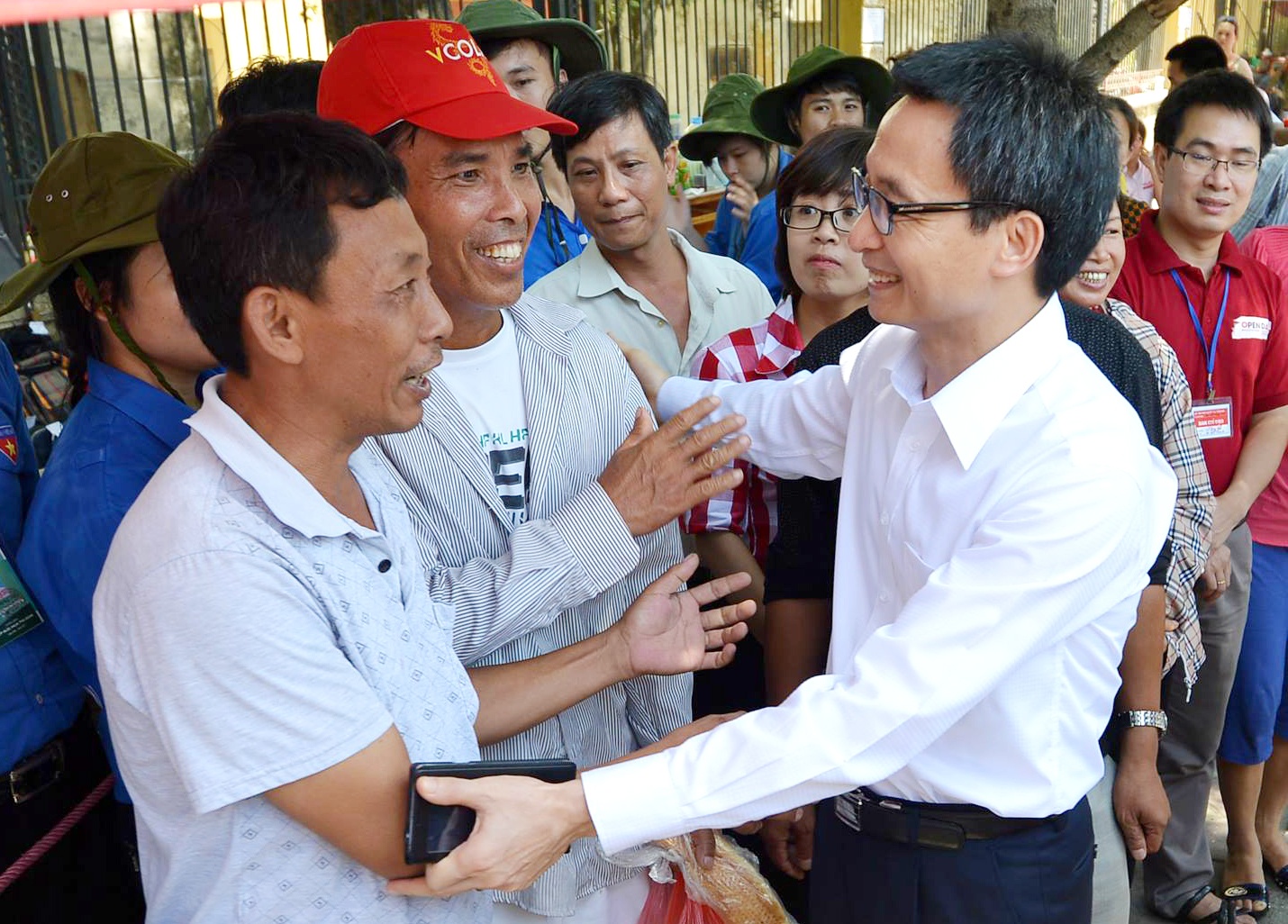 Trưa 1/7, nhìn thấy một phụ huynh cầm túi bánh mỳ đứng chờ con, Phó thủ tướng Vũ Đức Đam nói: "Trời nắng nóng mà hai bố con chỉ ăn bánh mỳ thế này sao đảm bảo sức khỏe được".