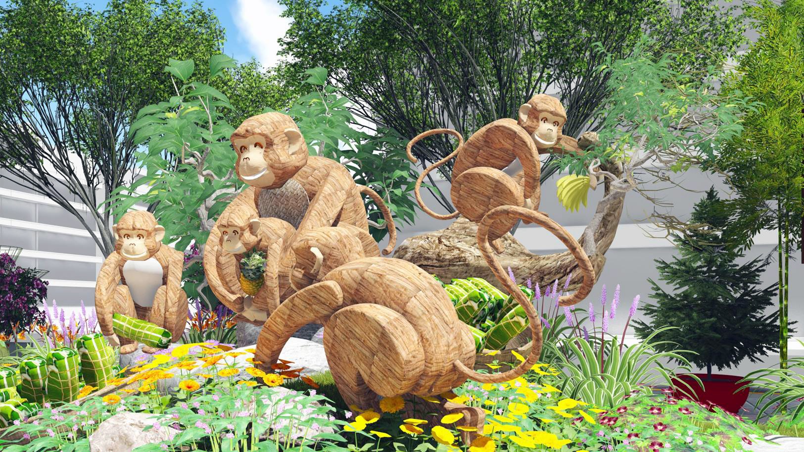 | Phối cảnh cổng chính đường hoa Tết Bính Thân với 2 cụm linh vật là gia đình khỉ hai bên. Lãnh đão UBND TP HCM đã yêu cầu các đơn vị thi công phải giữ nguyên trạng, không được gây ảnh hưởng đến kết cấu của phố đi bộ. |