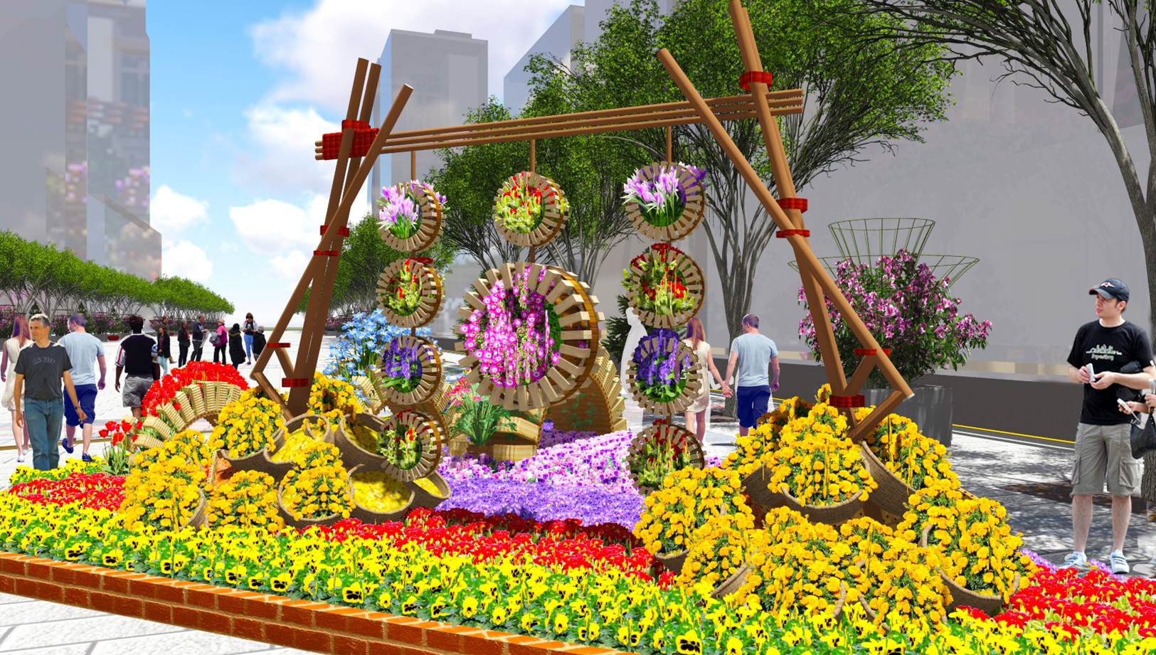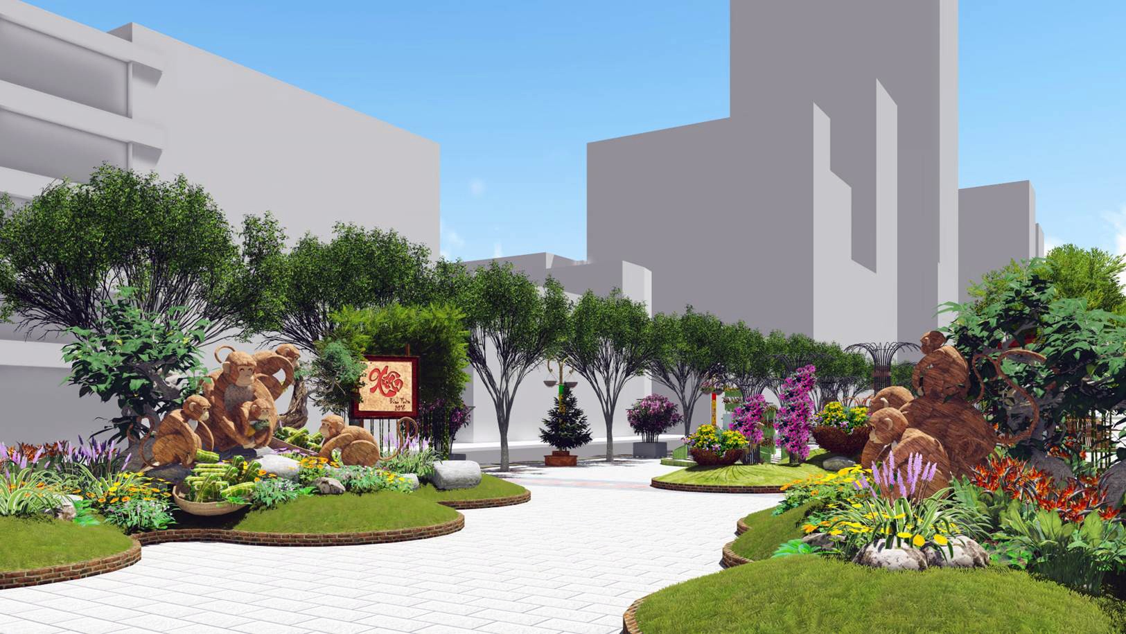 | Hình ảnh linh vật năm nay là gia đình khỉ được bố trí ở 2 bên, chính giữa là đại cảnh Hoa Kết Đoàn nhiều màu sắc. Xuyên suốt trên đường hoa là các tiểu cảnh thể hiện sự đoàn kết, chung sức... |