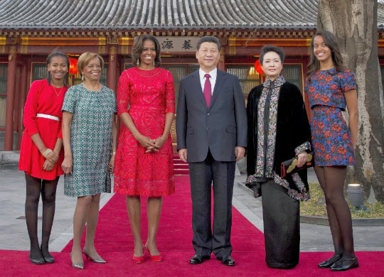 | Chủ tịch Tập Cận Bình và vợ chào đón Michelle Obama cùng hai con gái là Malia và Sasha khi bà thăm Trung Quốc năm 2014. Ảnh: Reuters |