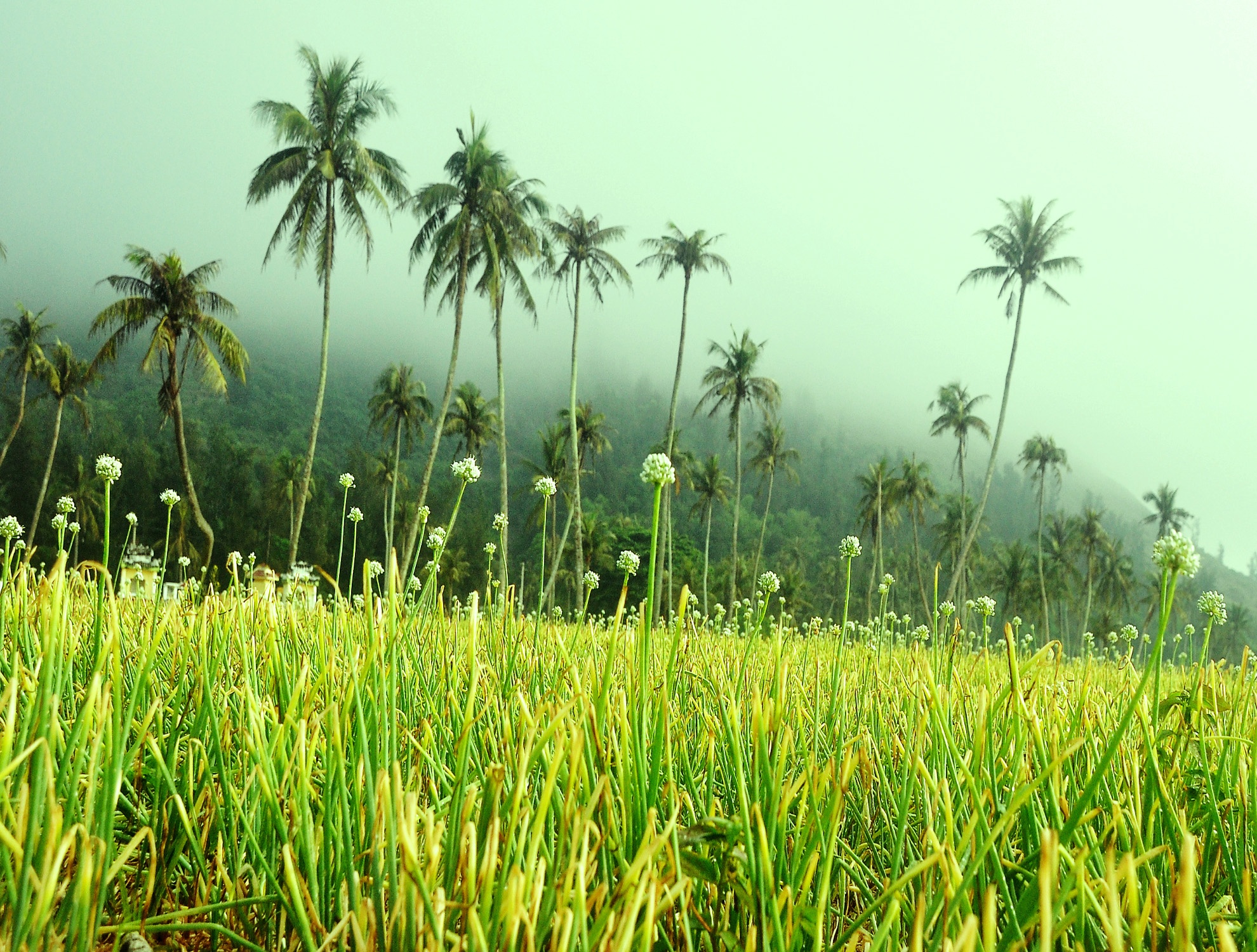 Sương mù trên cánh đồng hành, tỏi trong buổi bình minh.