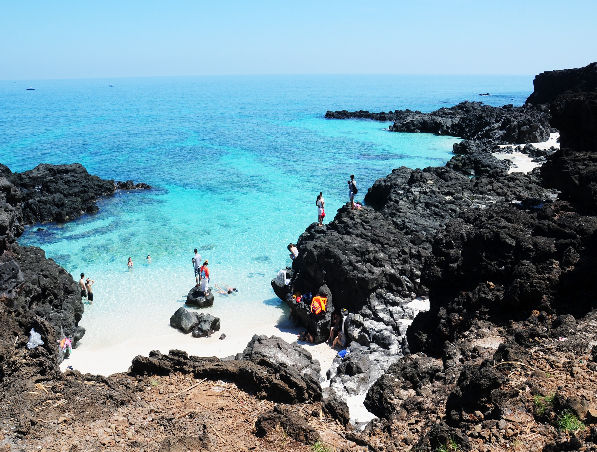 | Vách đá núi lửa tạo "cánh tay vòng cung" trườn mình ra phía biển, tạo thành khung cảnh thơ mộng ở xã đảo An Bình (huyện đảo Lý Sơn, Quảng Ngãi). |