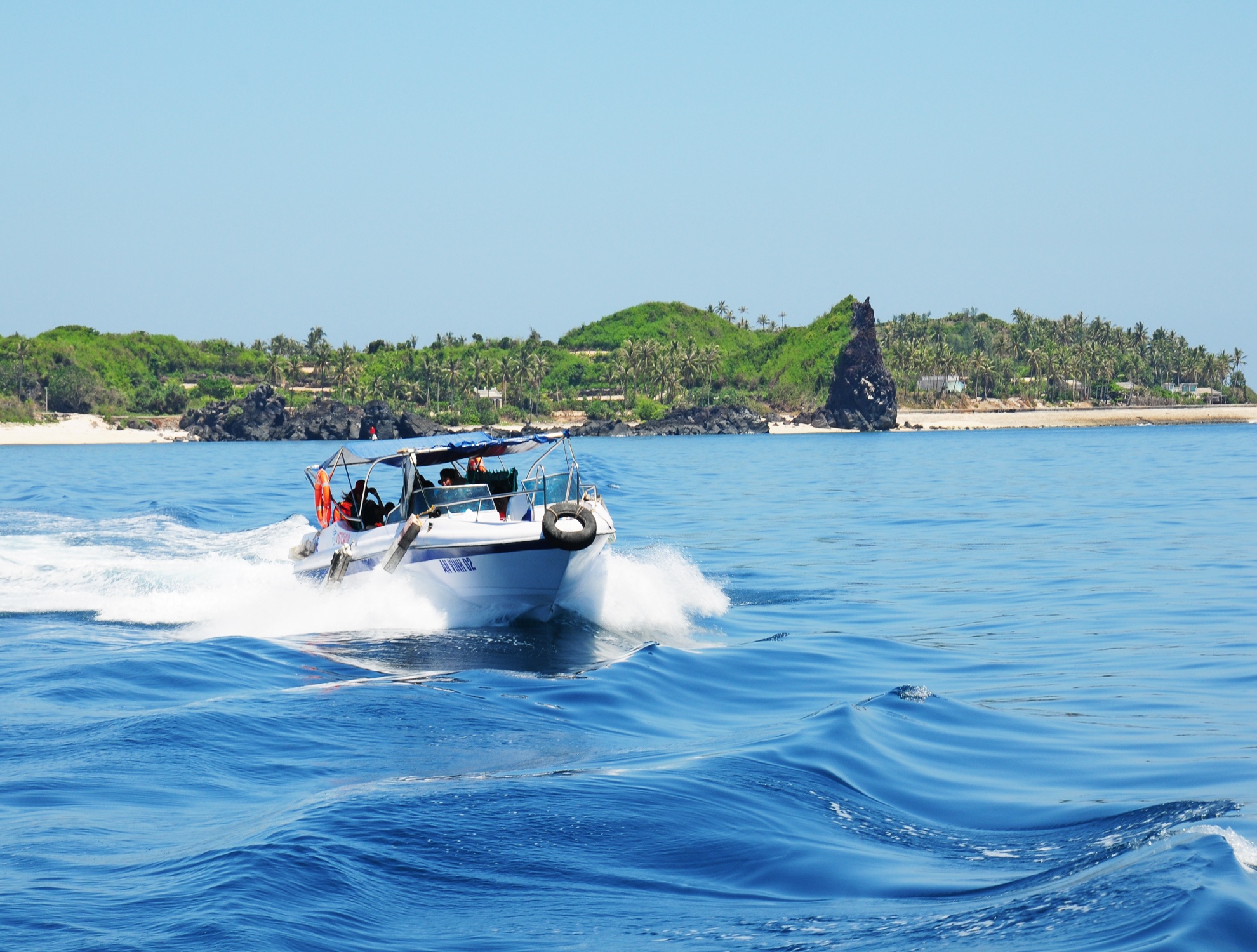 | Ca nô lướt sóng đưa du khách thưởng ngoạn trầm tích núi lửa độc đáo quanh đảo An Bình. |