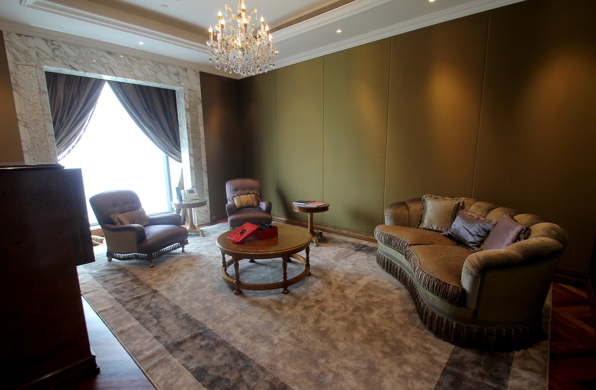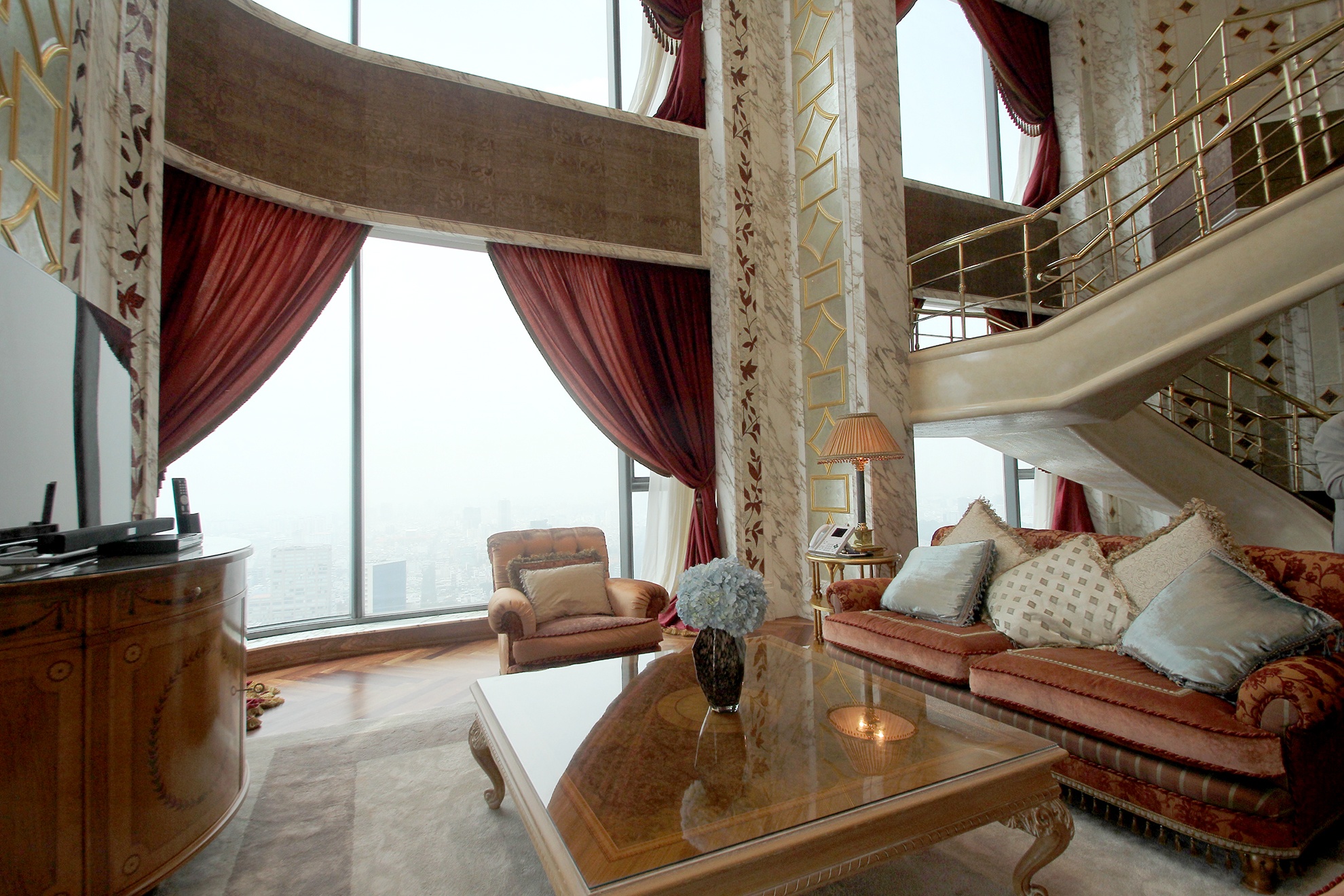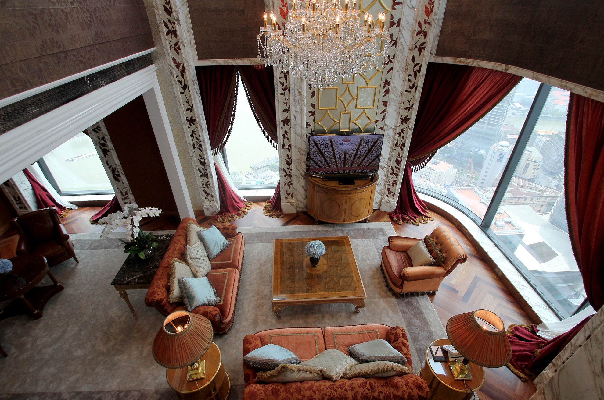 | Đáng chú ý là dãy phòng tiêu chuẩn nguyên thủ tại tầng 38 và 39, giá cho thuê một đêm là 17.000 USD (tương đương với gần 400 triệu đồng). Trong ảnh, gian tiếp khách của phòng này, có tầm nhìn đẹp. |