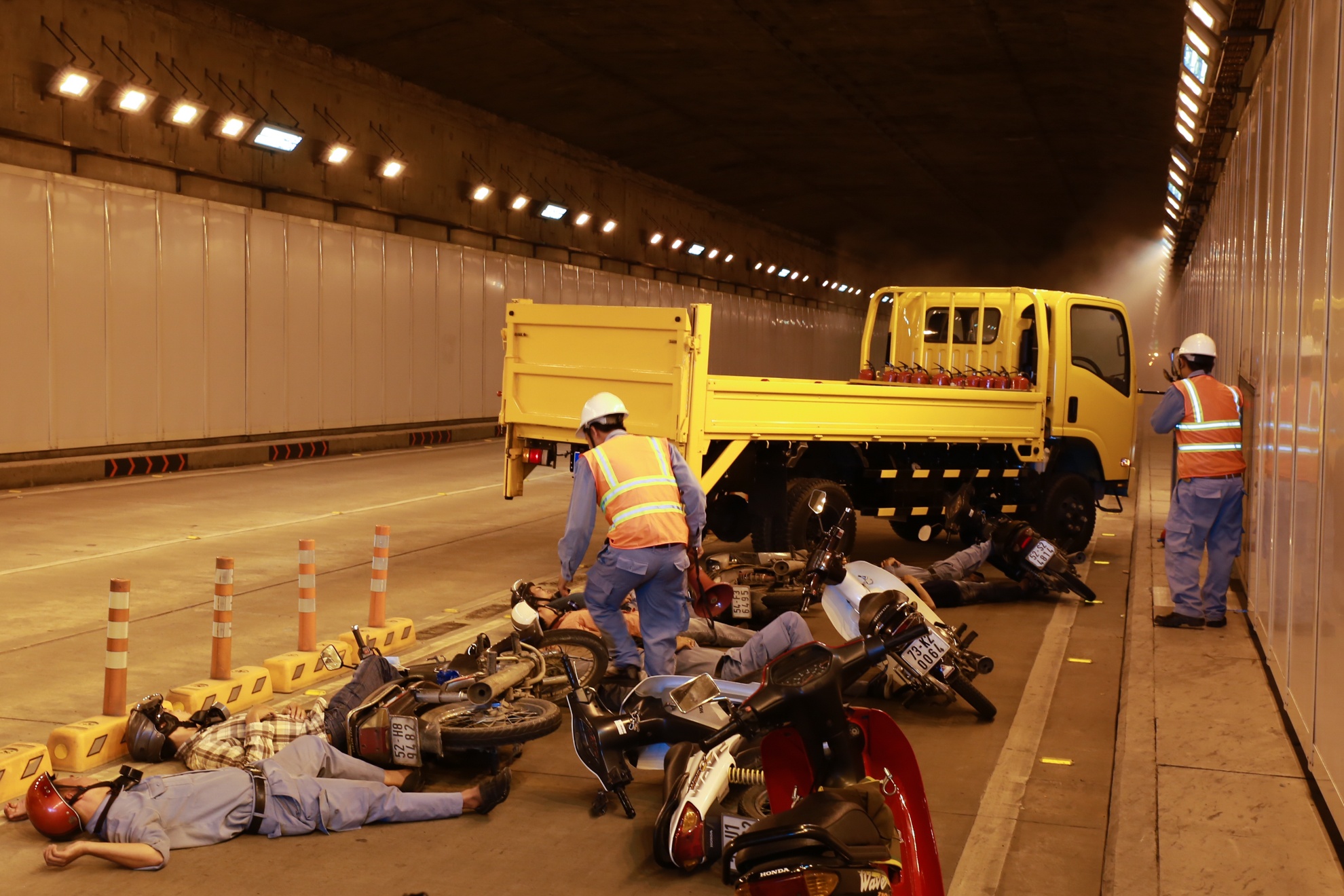 Trong kịch bản, xuất hiện tình huống tai nạn giao thông liên hoàn trong hầm và có xảy ra cháy nổ.