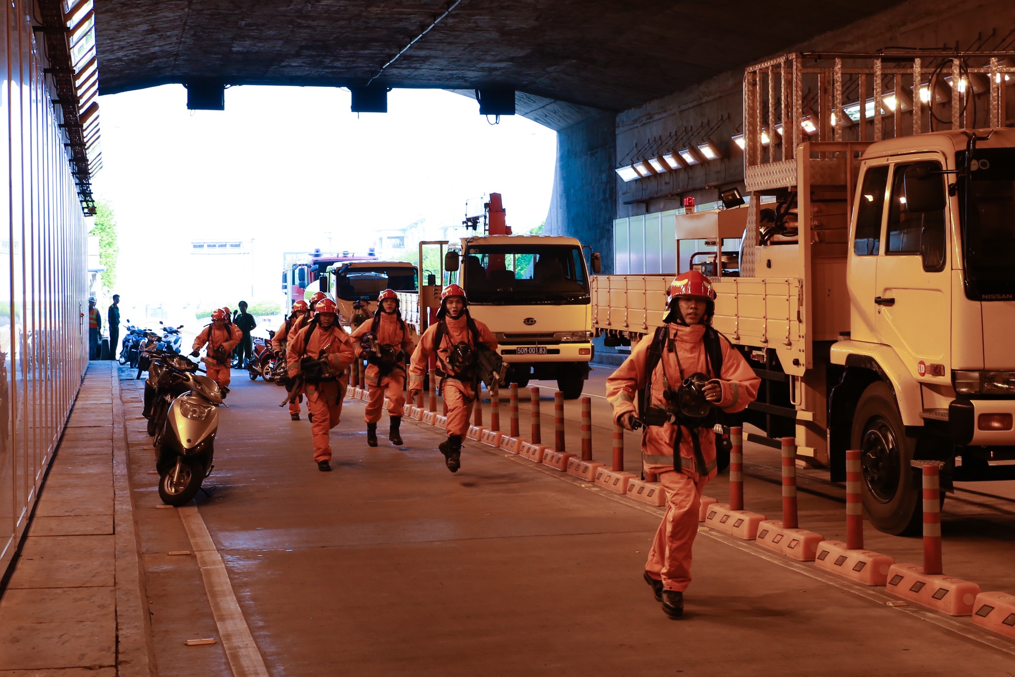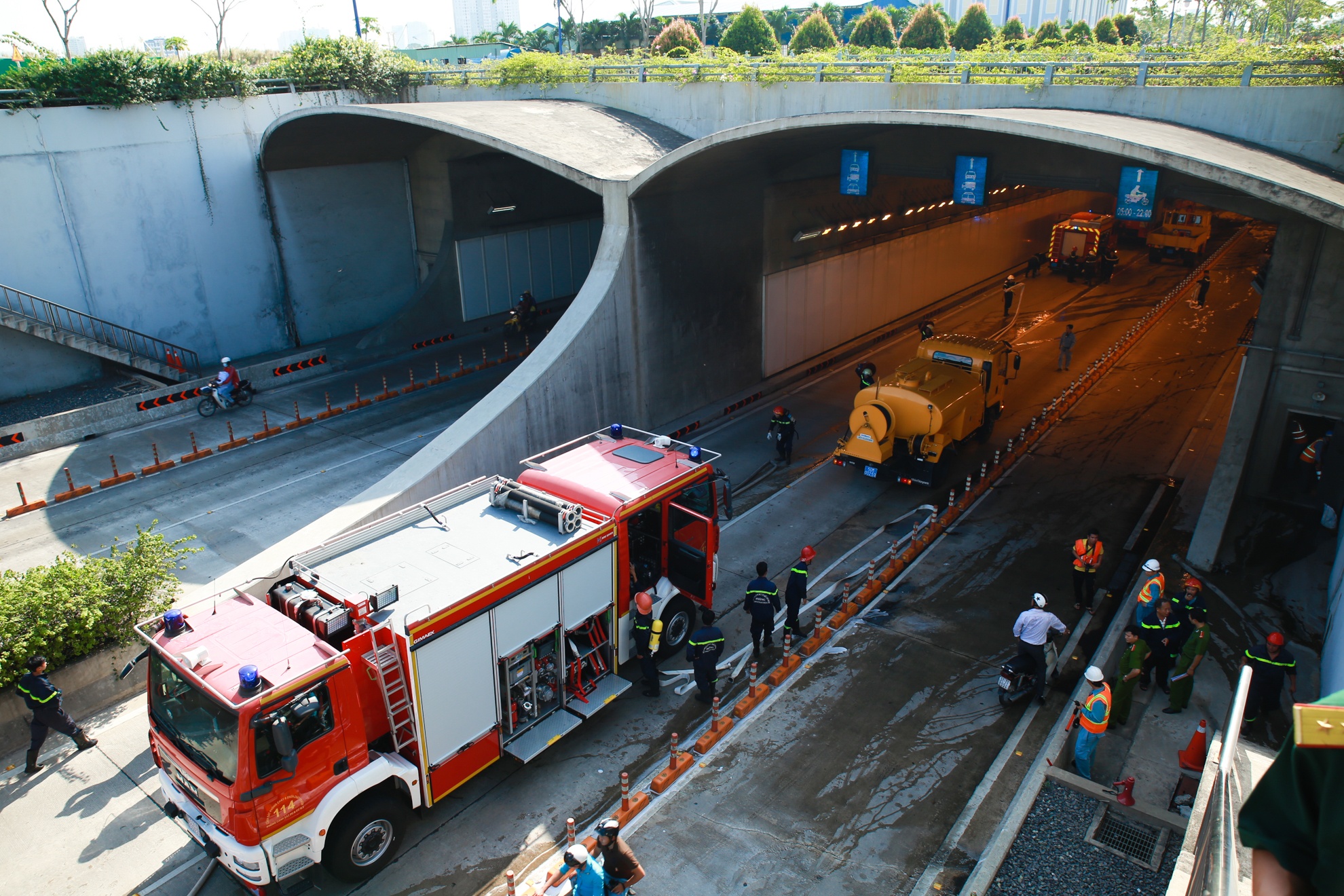 14h chiều 28/10, hầm vượt sông Thủ Thiêm (TP HCM) phong tỏa, cấm đường. Bên trong, lực lượng cảnh sát phòng cháy chữa cháy thực hiện cuộc diễn tập nhanh chuẩn bị cho buổi diễn tập chính thức ngày 30/10/2015.