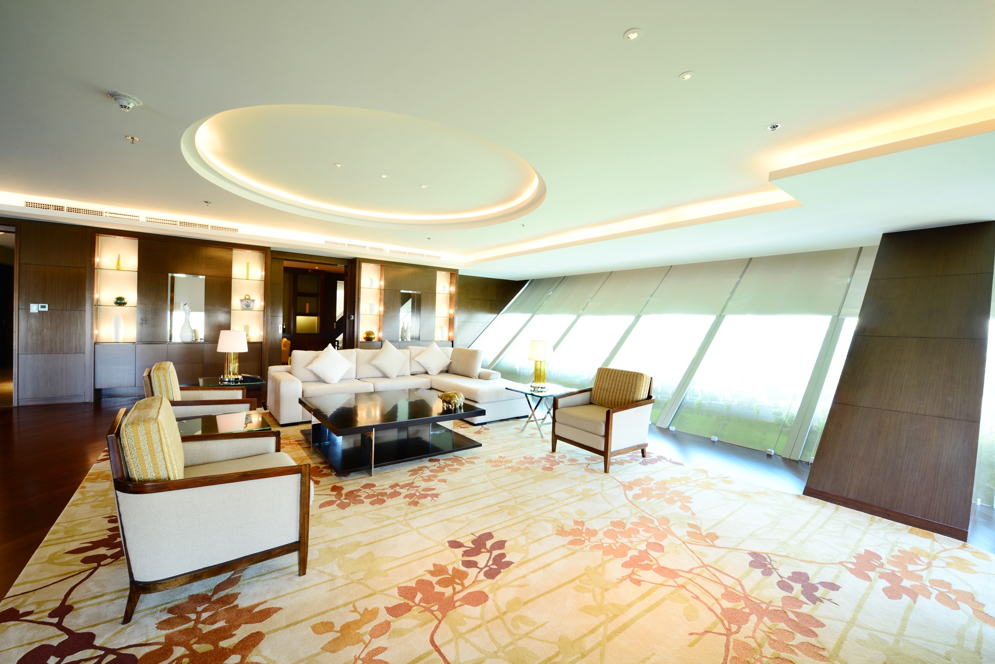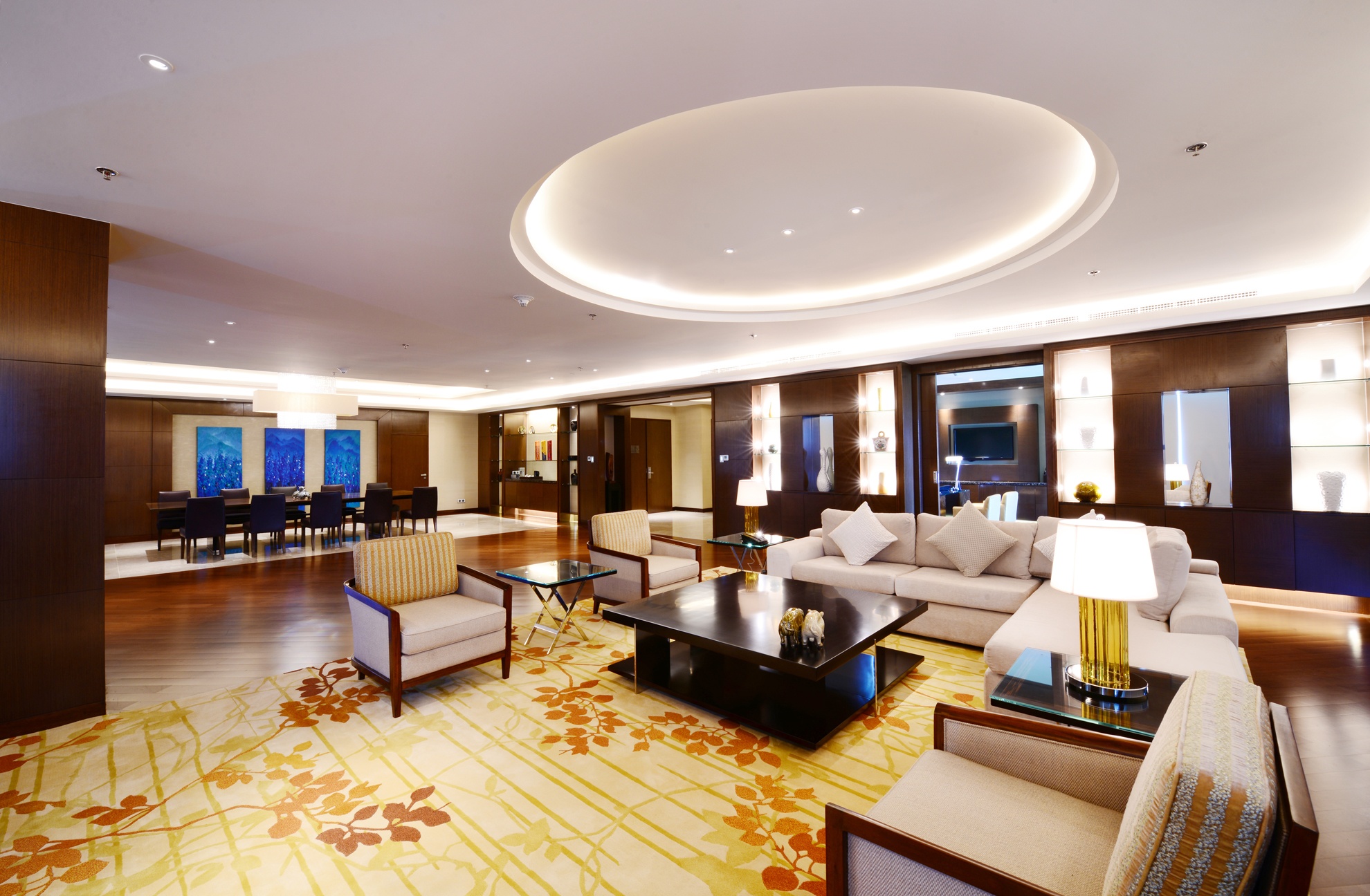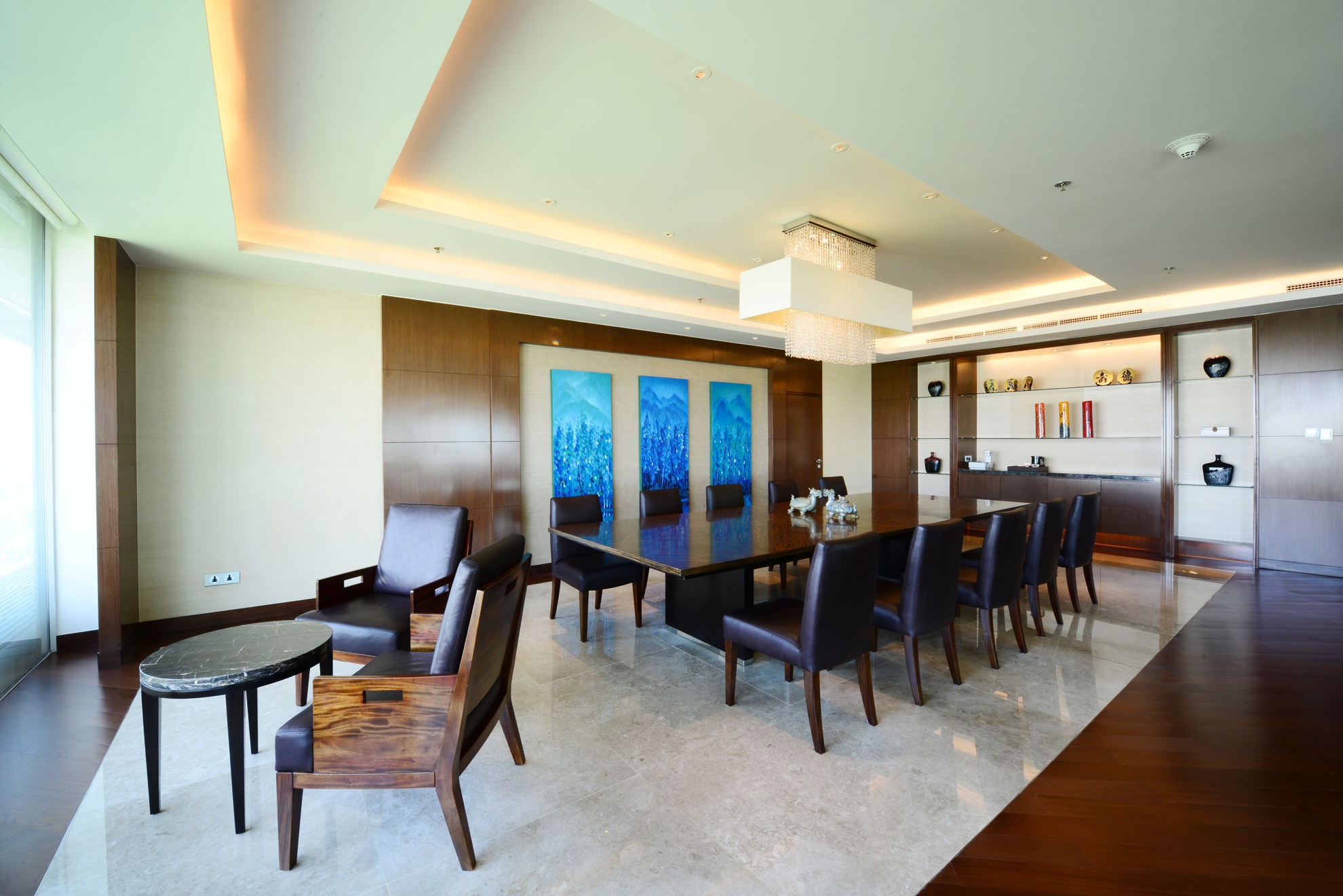 Một góc phòng khách được bài trí bàn làm việc cho 10 người, có thể dùng làm bàn họp hoặc bàn ăn. Bữa sáng, bữa trưa và cocktail buổi tối ở Executive Lounge nằm trên tầng 6 sẽ được check-in riêng, đảm bảo quyền riêng tư và bảo mật. Đồ ăn nhẹ được phục vụ cả ngày.