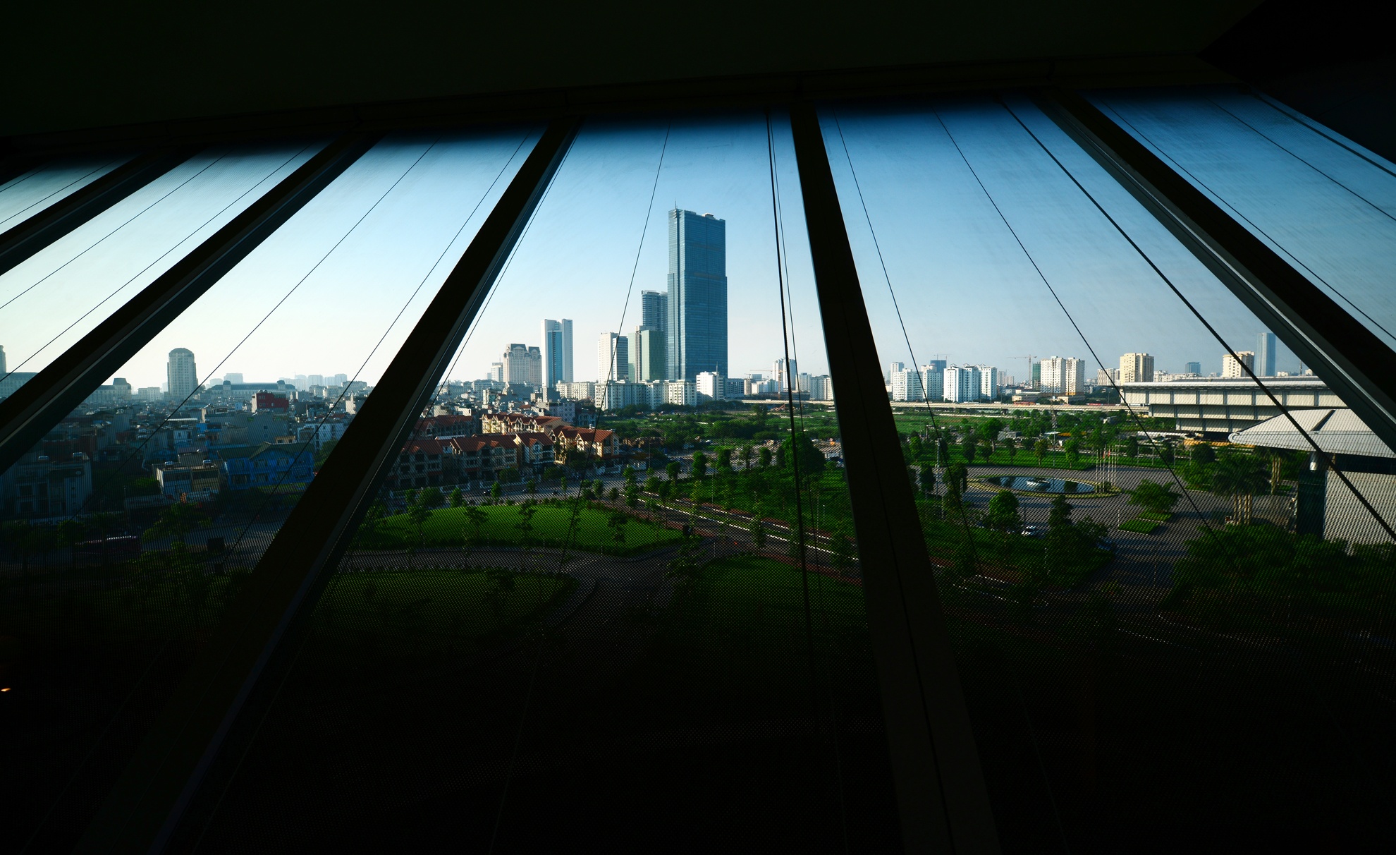 | Đây cũng là một trong những căn phòng có view đẹp nhất của khách sạn "Con rồng huyền thoại". Với 3 mặt tiền và góc view 270 độ cùng cửa sổ nghiêng, khách có thể thoải mái ngắm nhìn Hà Nội qua các ô kính lớn. Trong ảnh: Góc nhìn ra Trung tâm hội nghị Quốc gia từ cửa sổ bàn họp. |