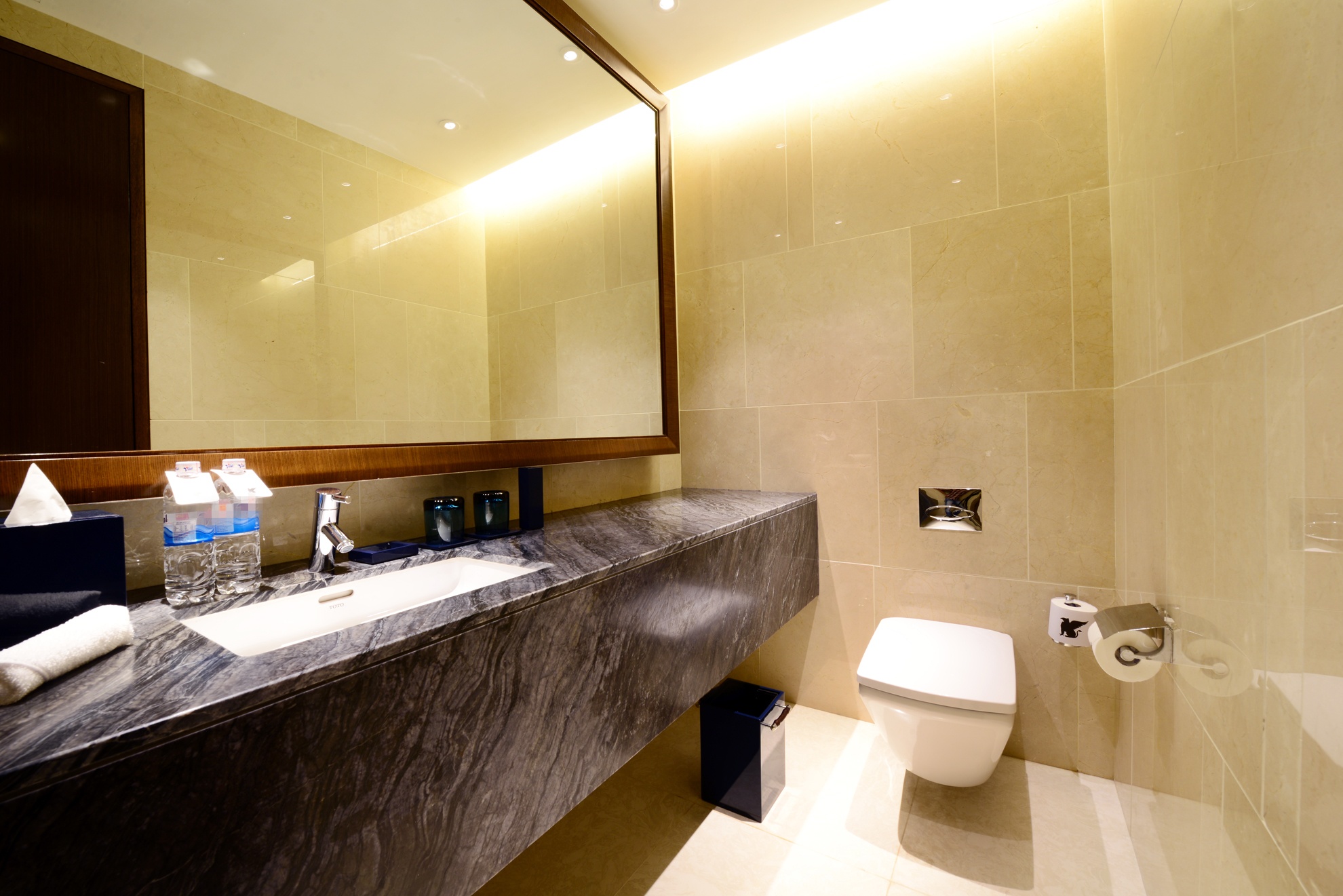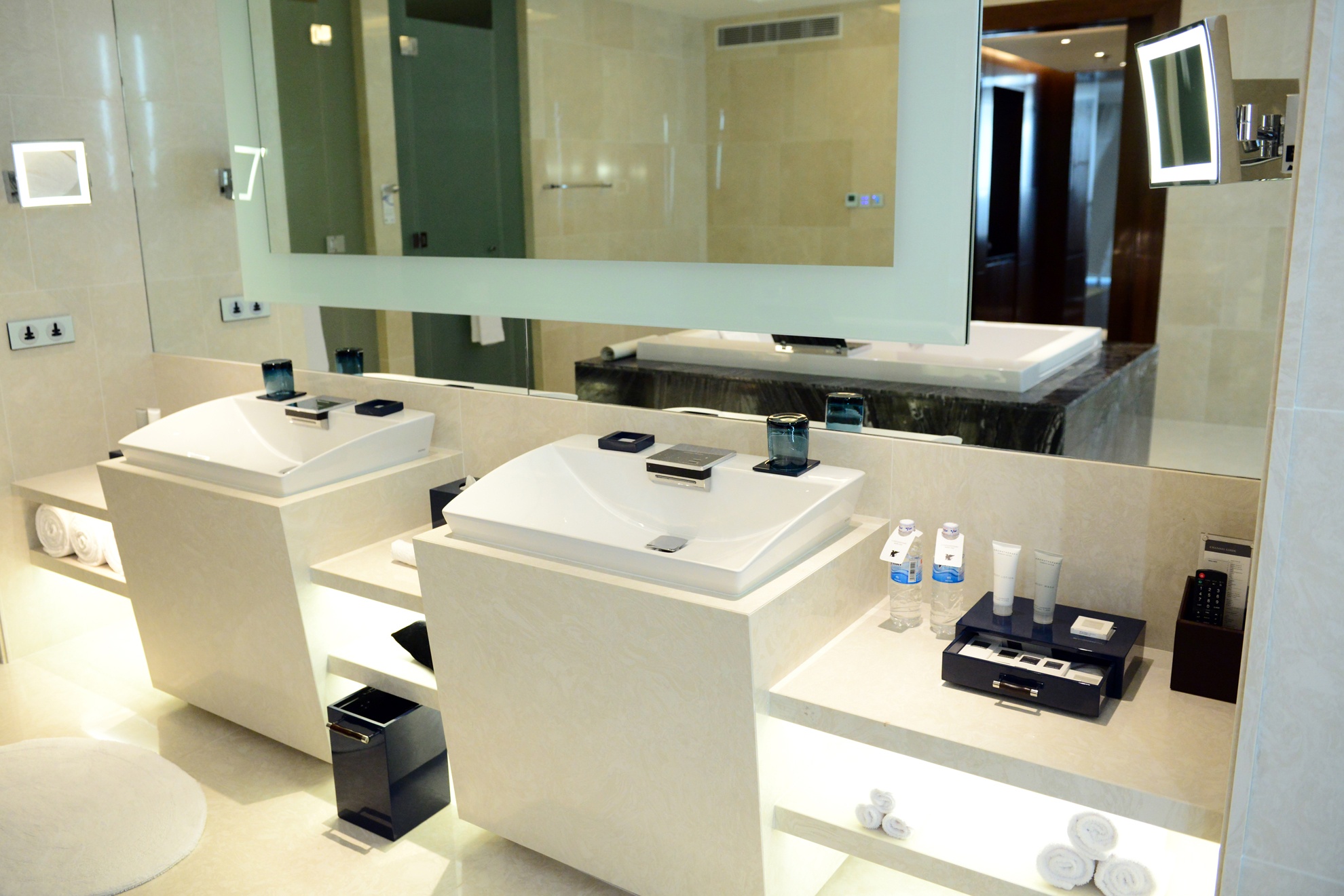 Gương lớn cùng hai lavabo sang trọng riêng biệt với đầy đủ các đồ dùng cao cấp.