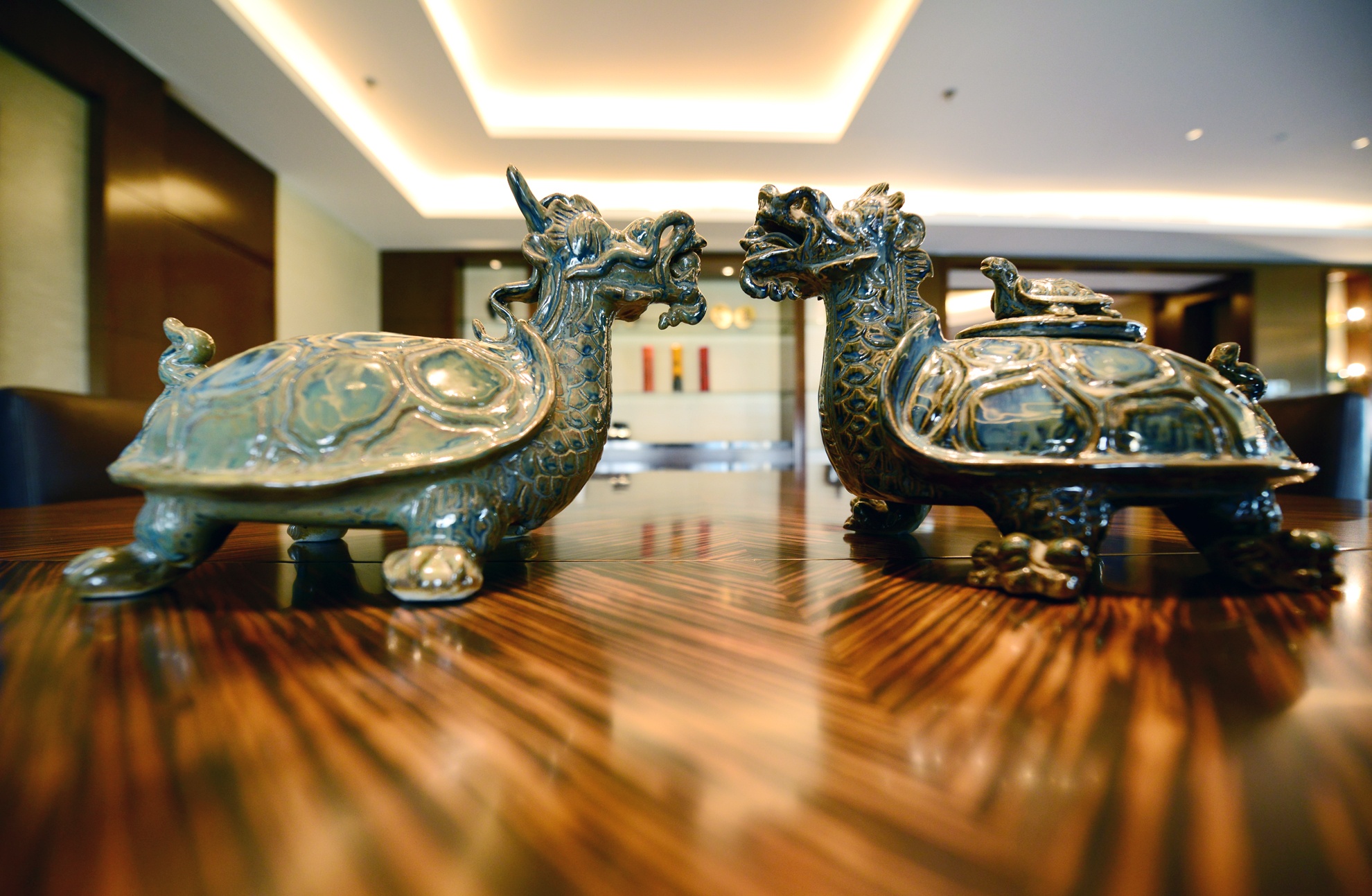 | Cách trang trí mang nét Á đông đặc trưng với những hình tượng rồng, rùa vàng, trâu nước... trên bàn làm việc giúp khách cảm nhận được văn hóa Việt Nam khi ở phòng tổng thống. |